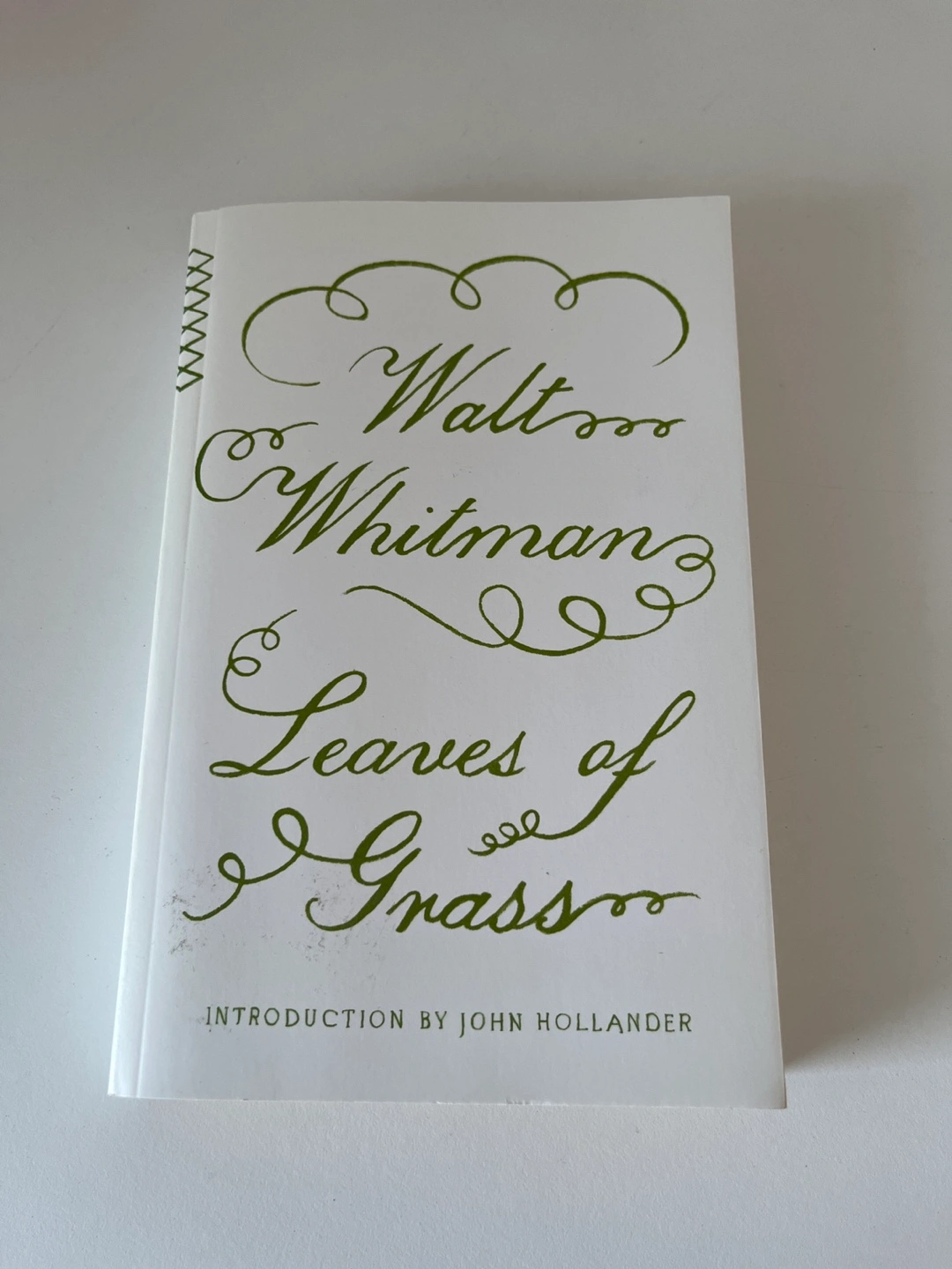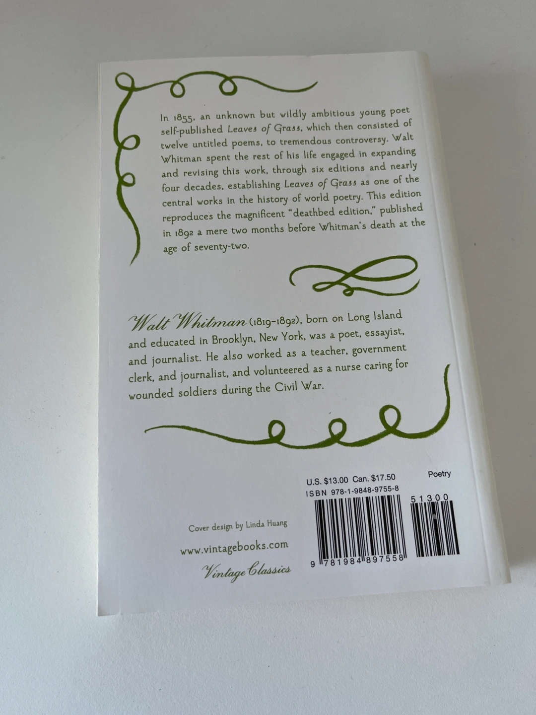 130Paperback book by Walt Whitman with an introduction by John Hollander. Vintage Classics edition. Cover design by Linda Huang.