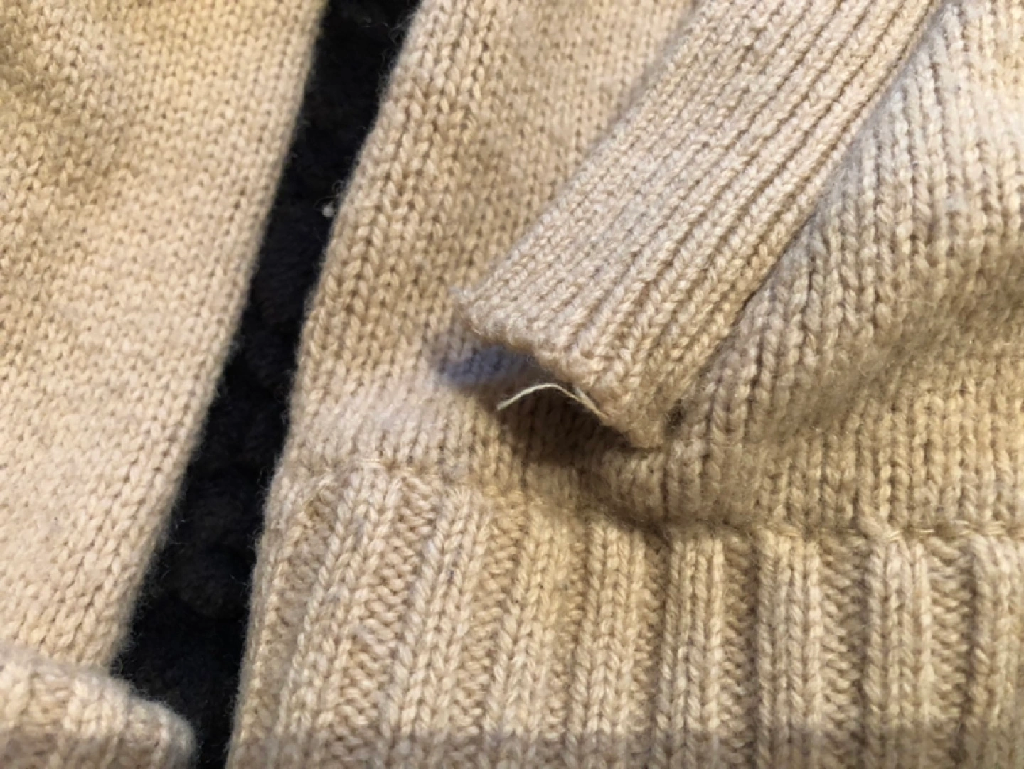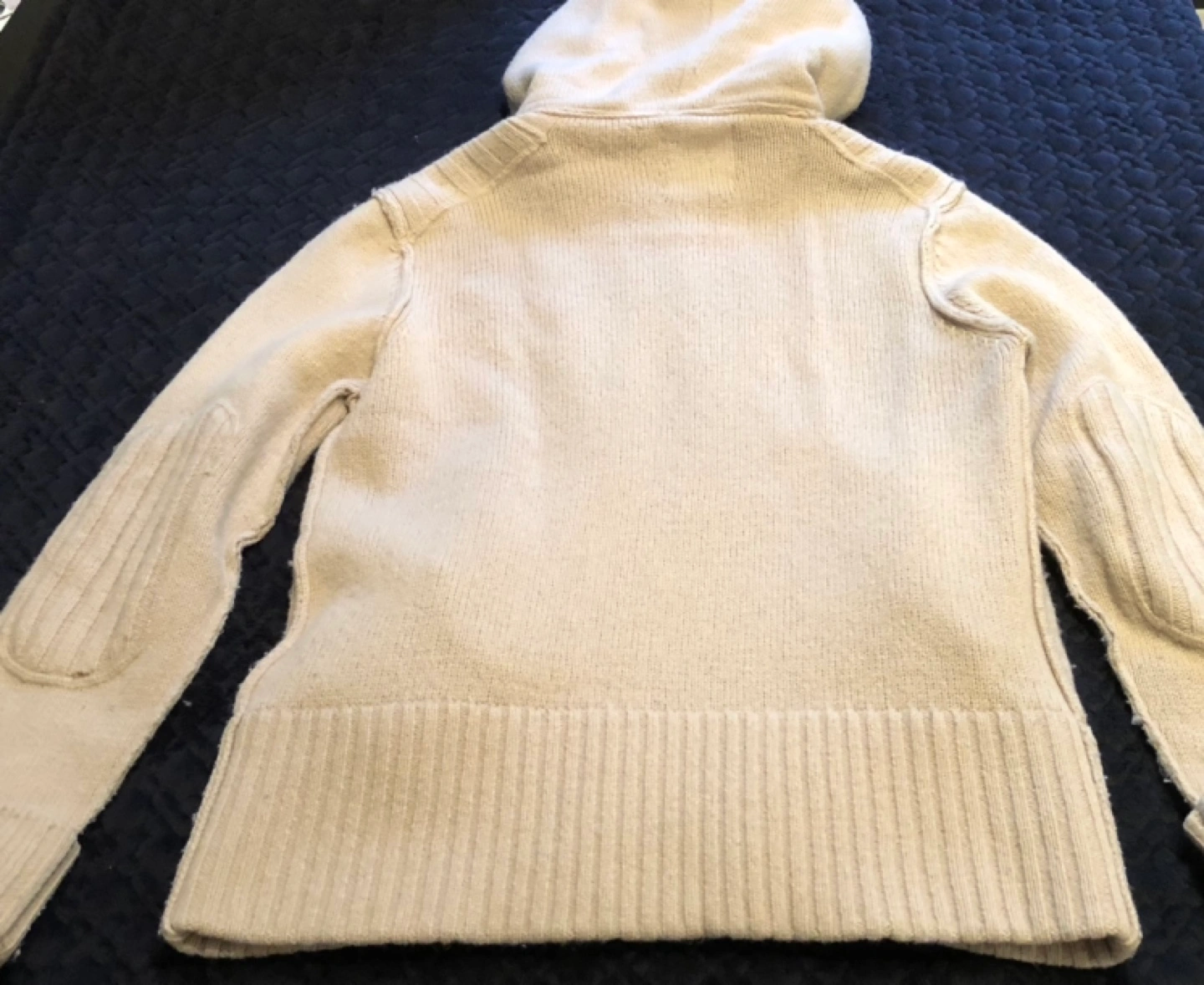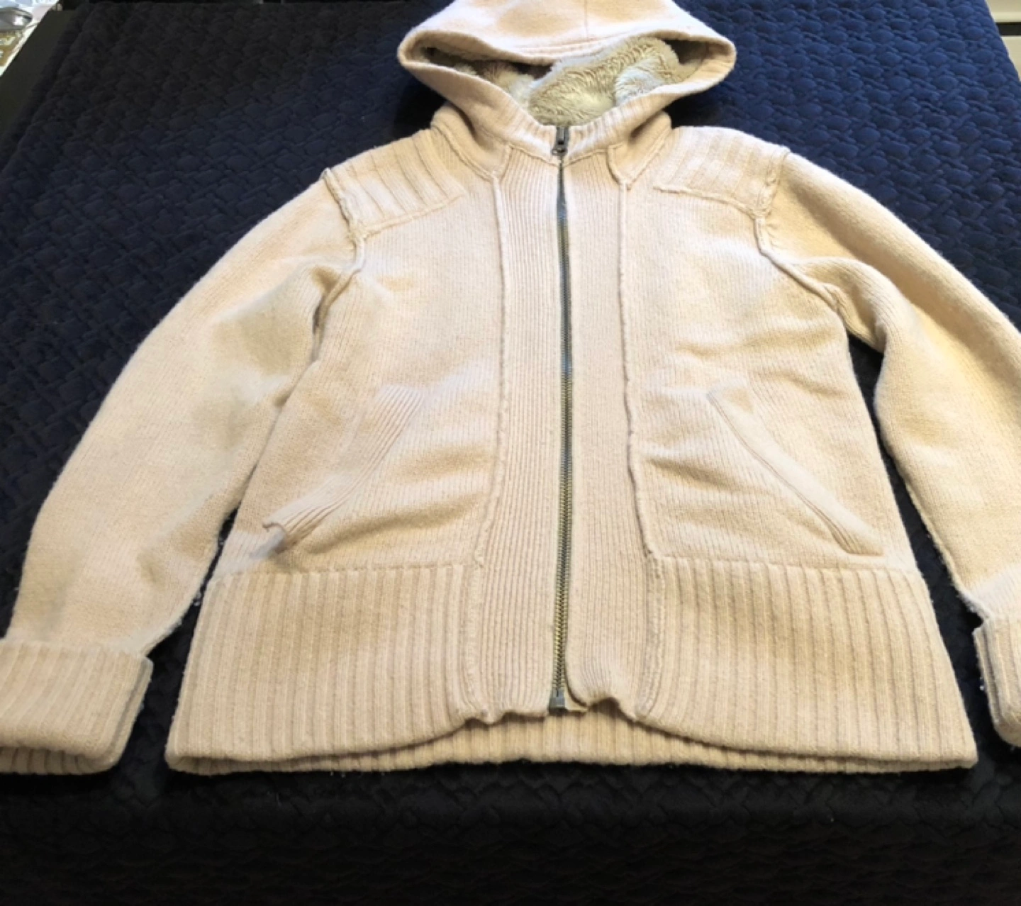 Cream coloured cardigan with a hood. Has a zipper closure and is lined with a soft material. Has two front pockets. One pocket needs a couple of stitches. Located in the West End.