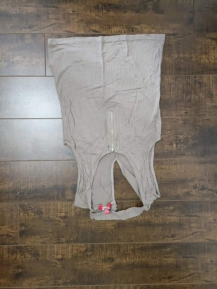 Grey ribbed tank top with zipper. Sleeveless, open back.