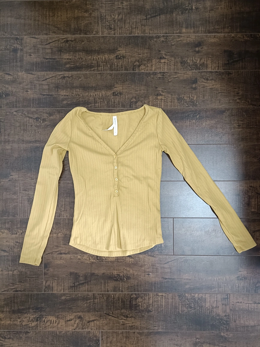 Long sleeve shirt with a V-neck and button detail. Ribbed material.