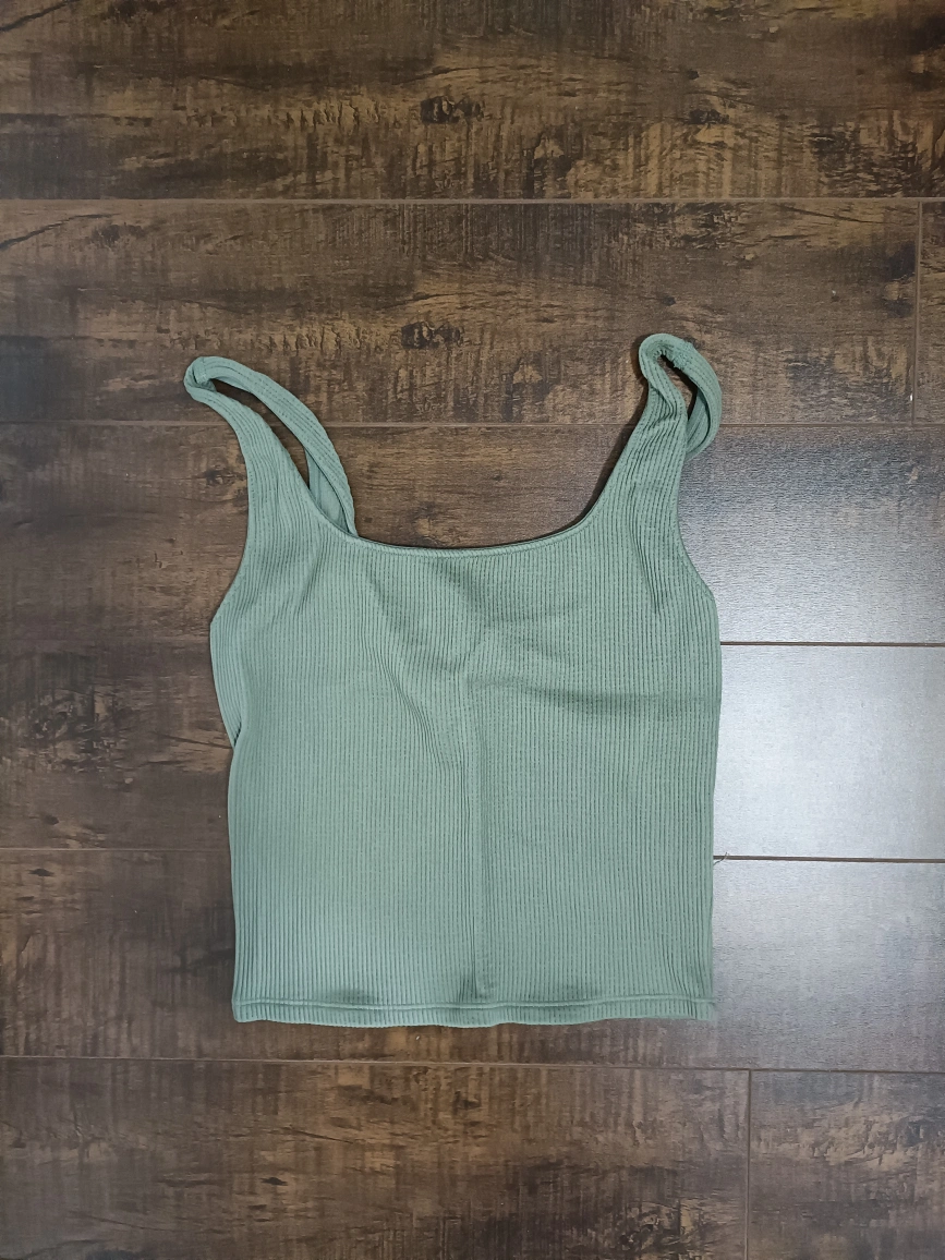 Green ribbed tank top. Sleeveless.