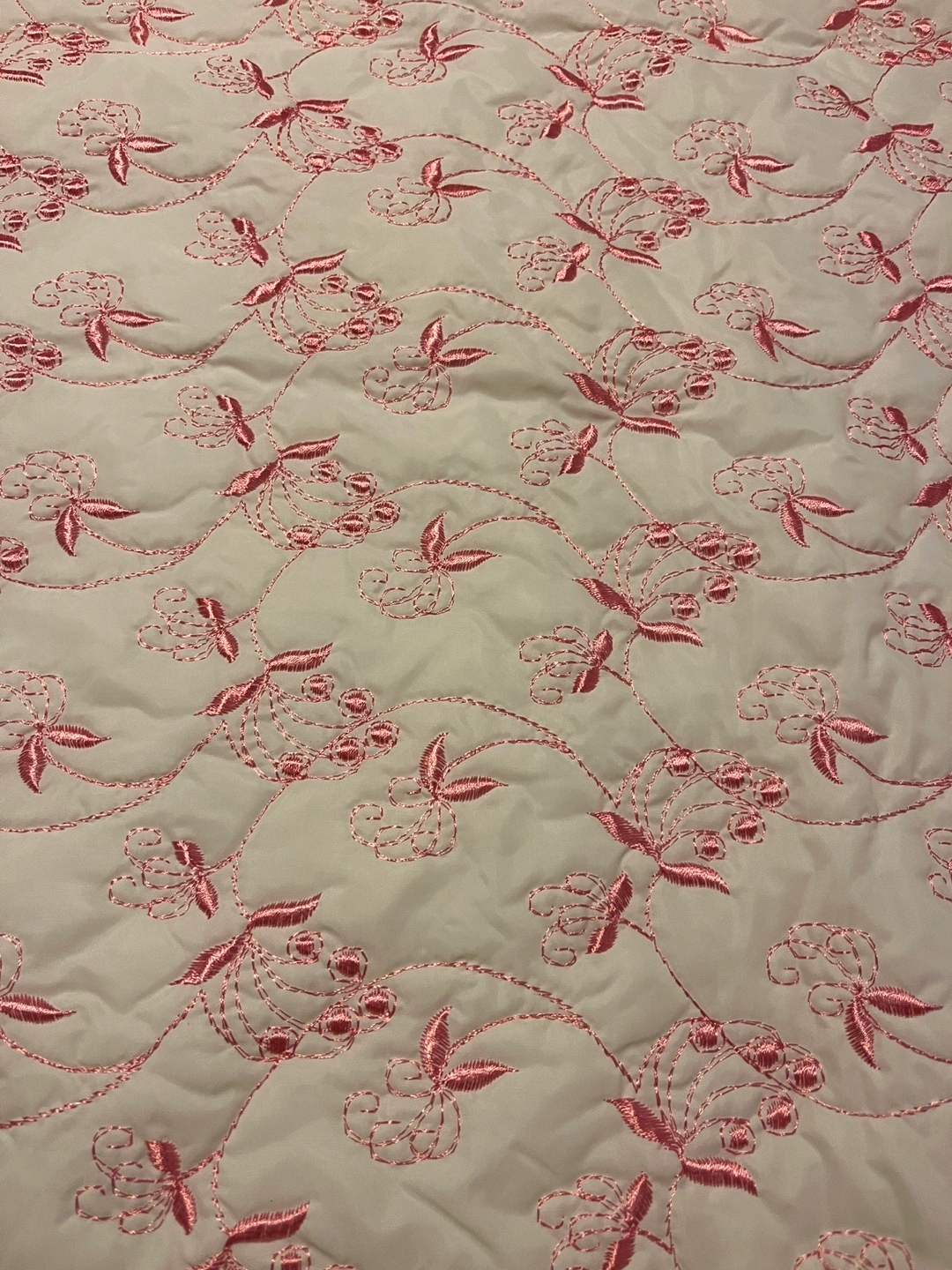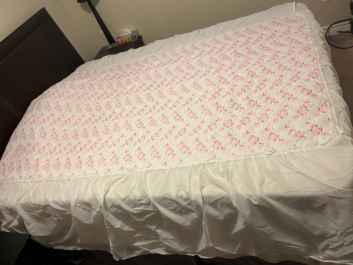 Brand new condition - never used! Please note this has been laid out on a queen sized bed for photography purposes. See actual measurements below. 100% polyester. White fabric with pink floral embroidery. Made by Miami Bedspread Manufacturing Company in Toronto, circa 1977.