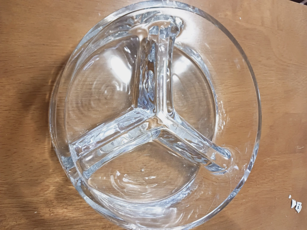 Clear glass serving dish with 3 compartments. 8"... Perfect for snacks, dips or appetizers.