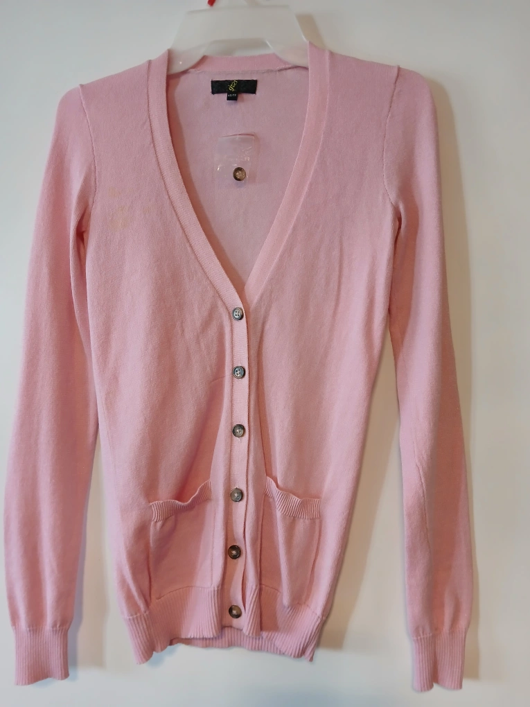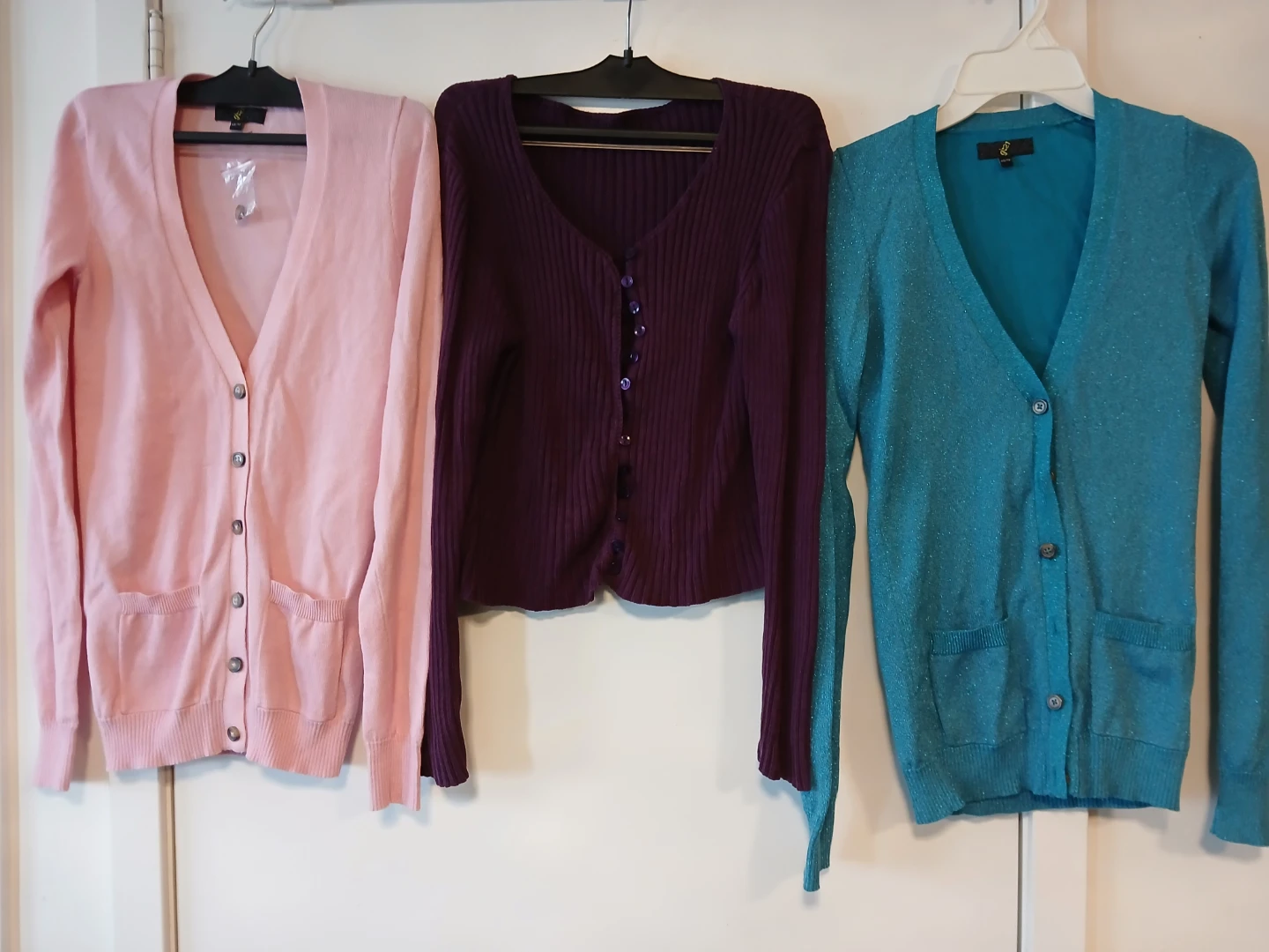 3 long-sleeved cardigans in pink (brand new), maroon and blue. Button closures, pockets, and ribbed detailing.