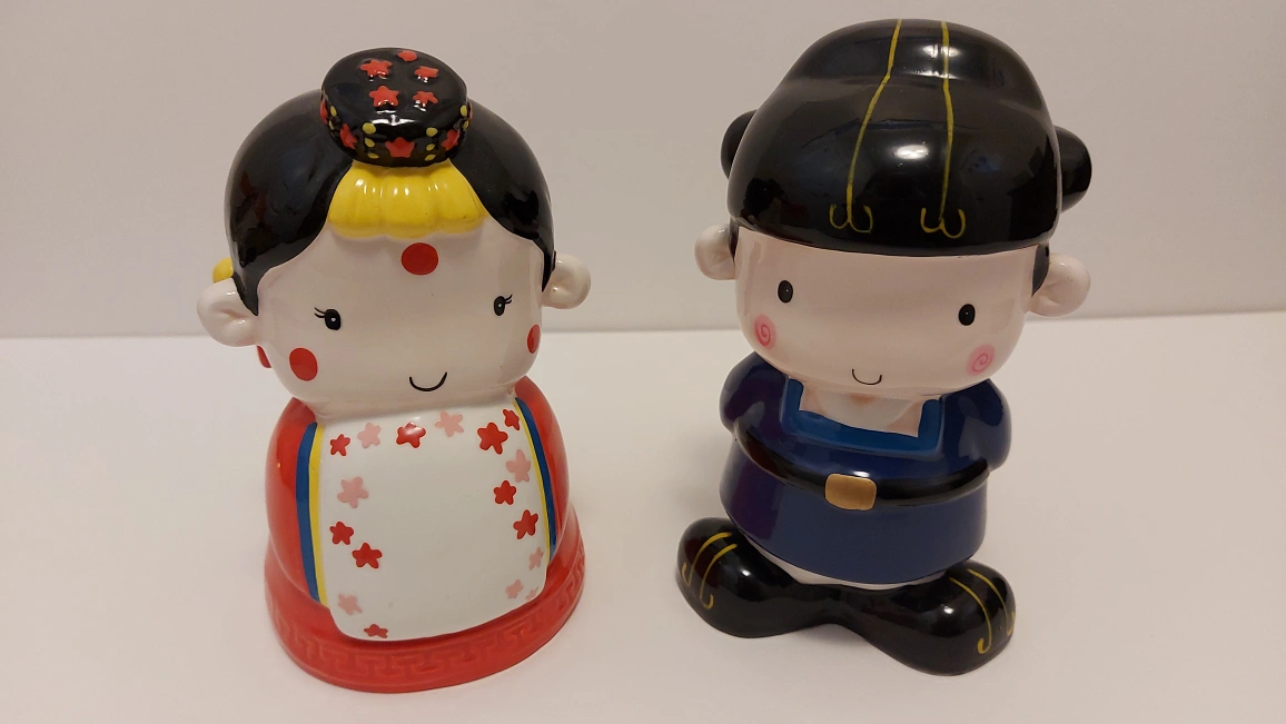 Ceramic coin bank set of a Korean couple, in colourful traditional clothing. Frottis brand from Korea. Both have a slot on the back for inserting coins. Good condition. Wife figurine has slight blemish on hair bun seen in pic. Dimensions are approximately: Groom 6.5 inches x 4 inches x 3 inches and Bride 6.5 inches x 3.75 inches x 3.75 inches