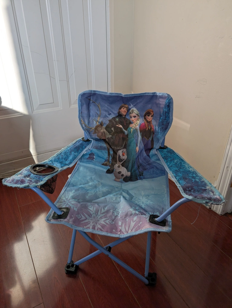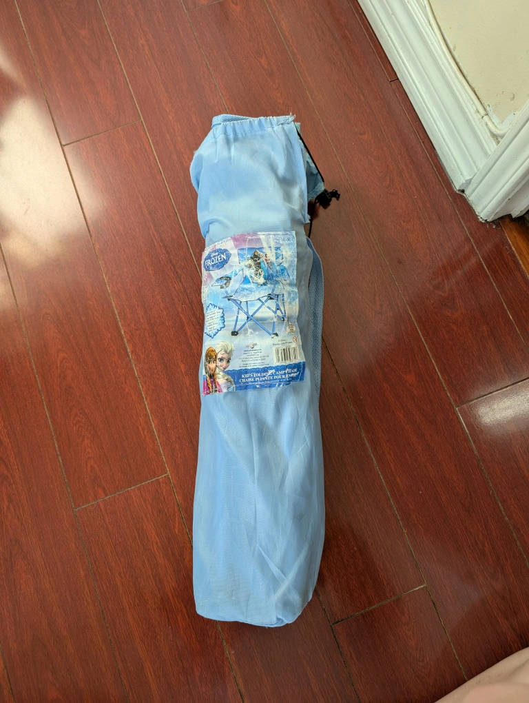 This is a folding camp chair. It is Frozen themed, mainly blue. It comes with a blue fabric case. It is still in pretty good condition, besides the fact is a bit dusty.