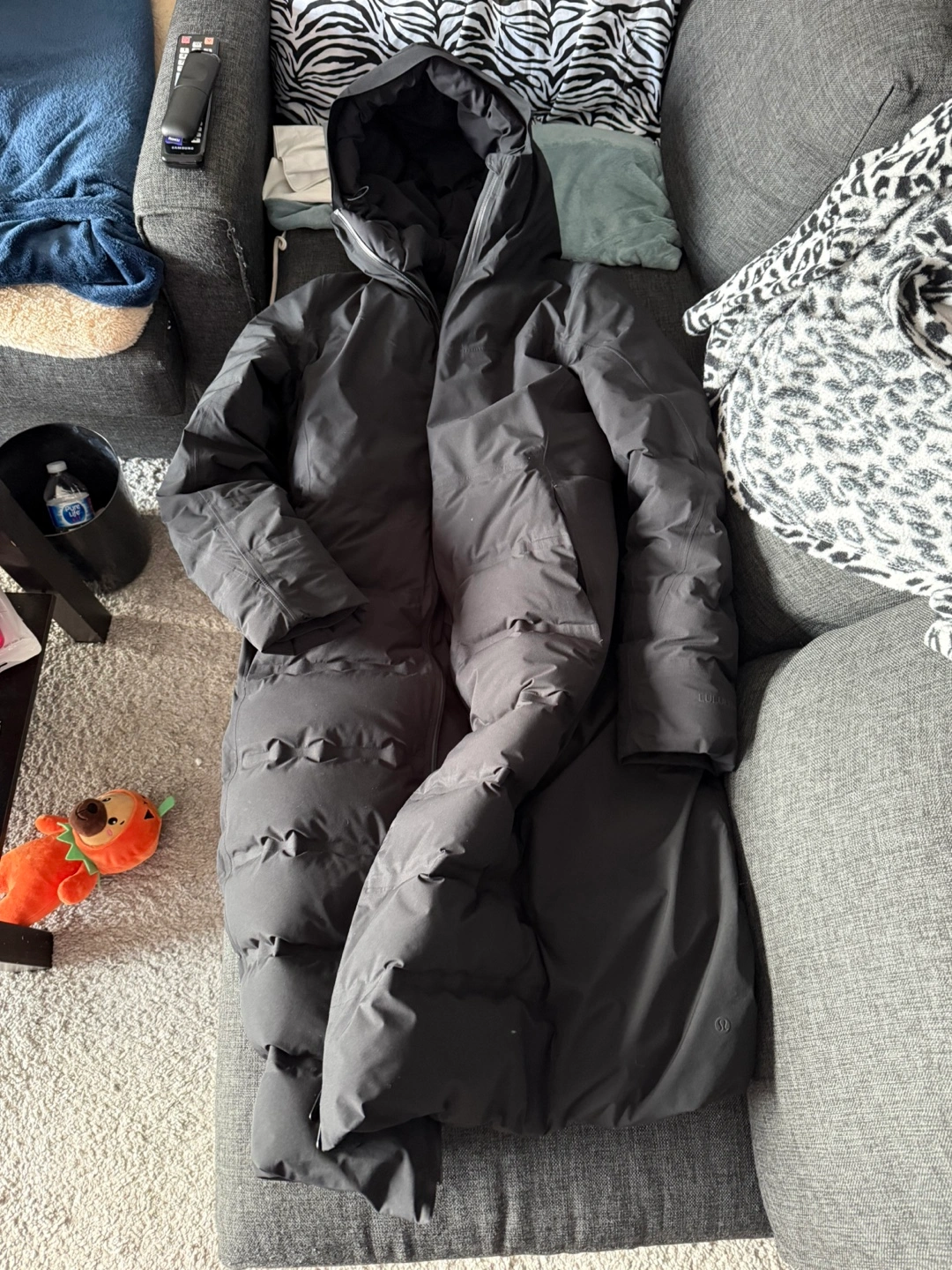 Long black down coat. Has hood and pockets. Sleet street jacket from Lululemon’s in size 12, colour is black. This jacket has been worn for half a season and is in EUC. It’s just too long for me so I’m looking to buy or trade for a shorter version