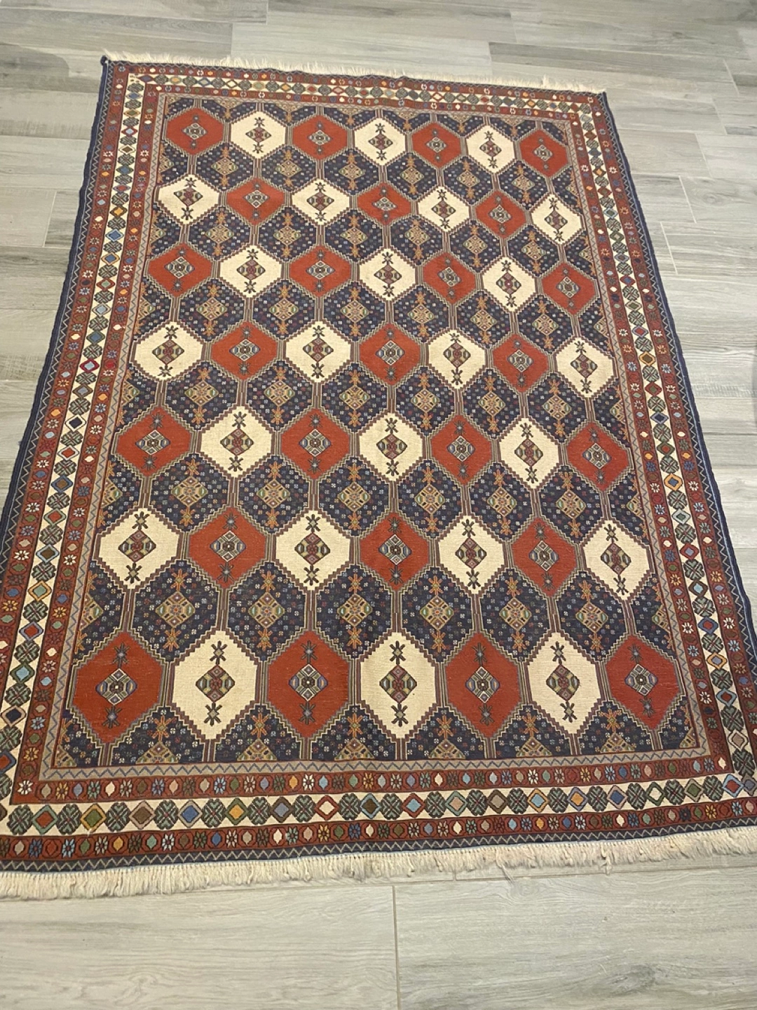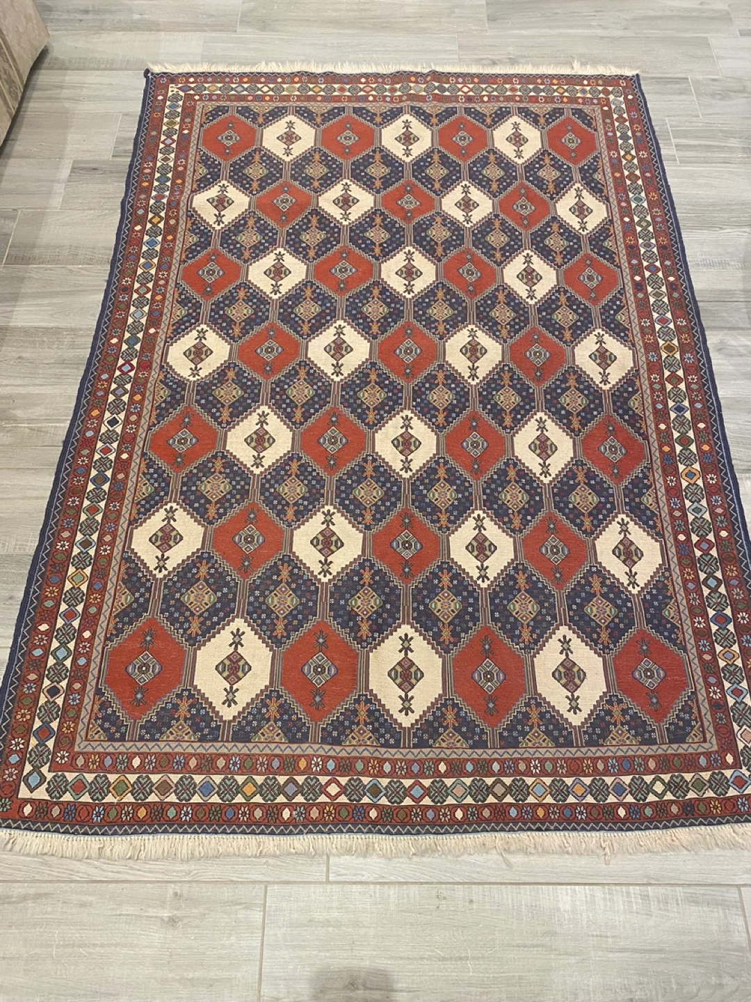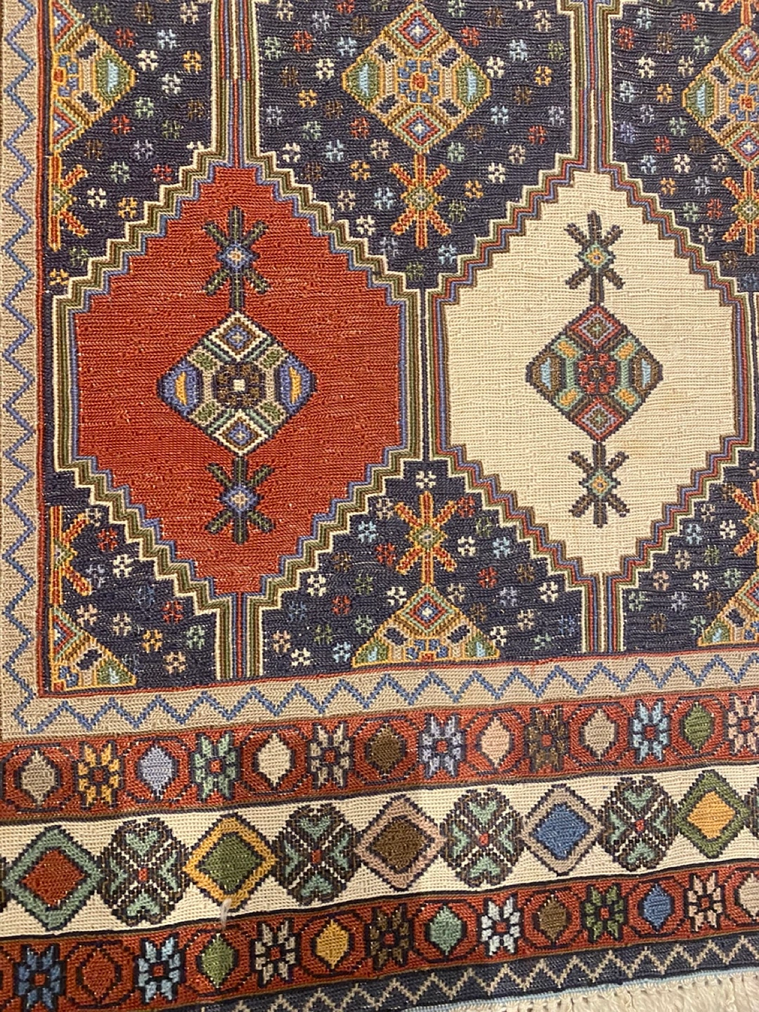 Large area rug with intricate patterns in red, blue, and white. Fringes on all sides. 150X212 cm this beautiful rug with vibrant colours will last forever perfect for you home or cottage.
