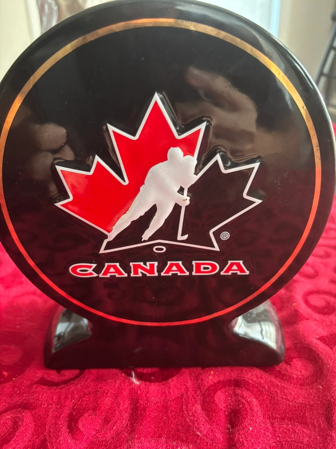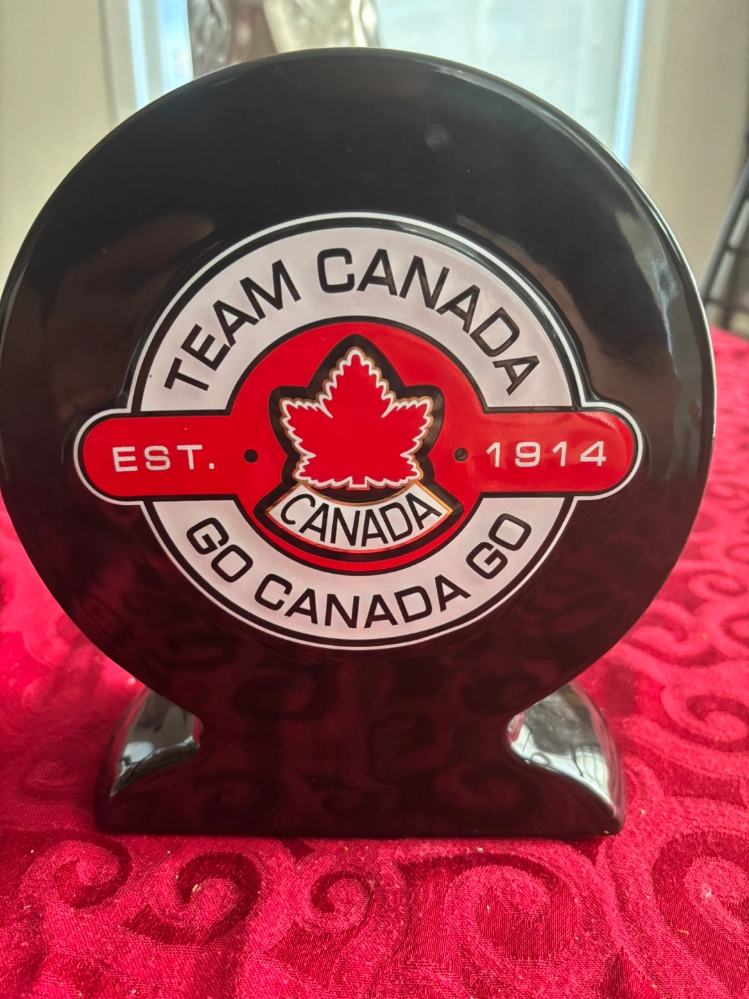 Team Canada Black and red ceramic money box with a hockey player and maple leaf design. Has a slot for coins on the top and an opening on the bottom.