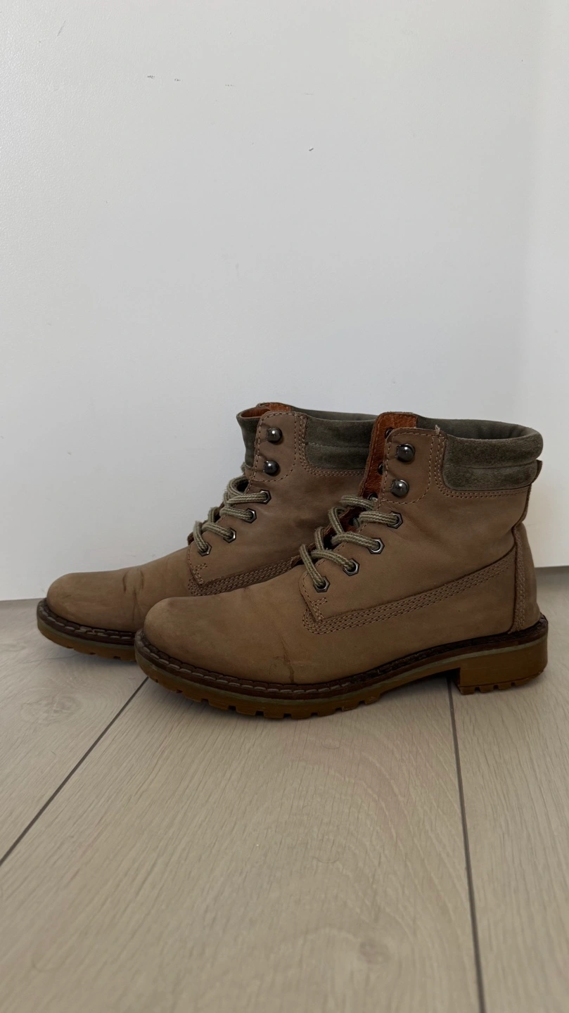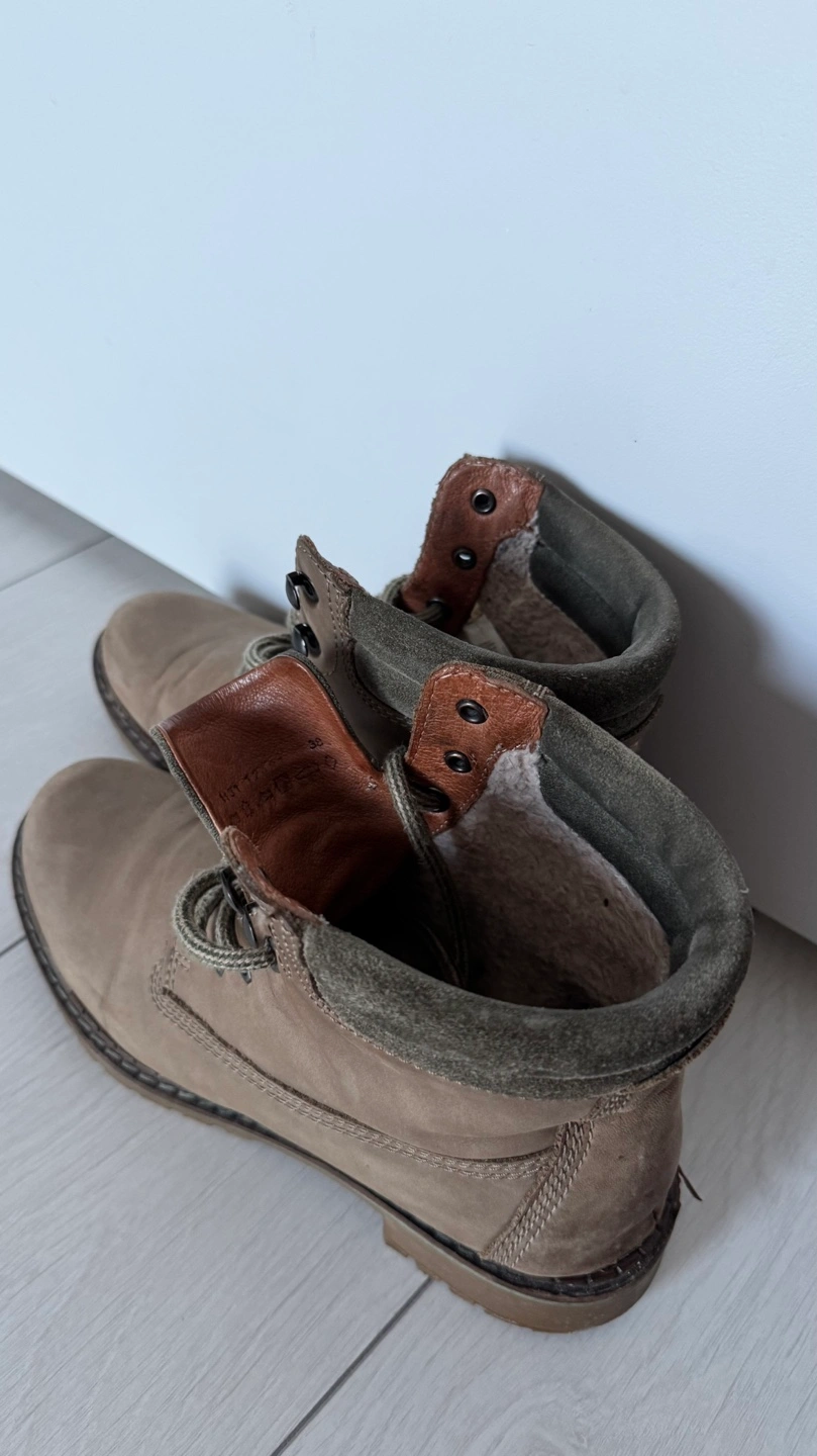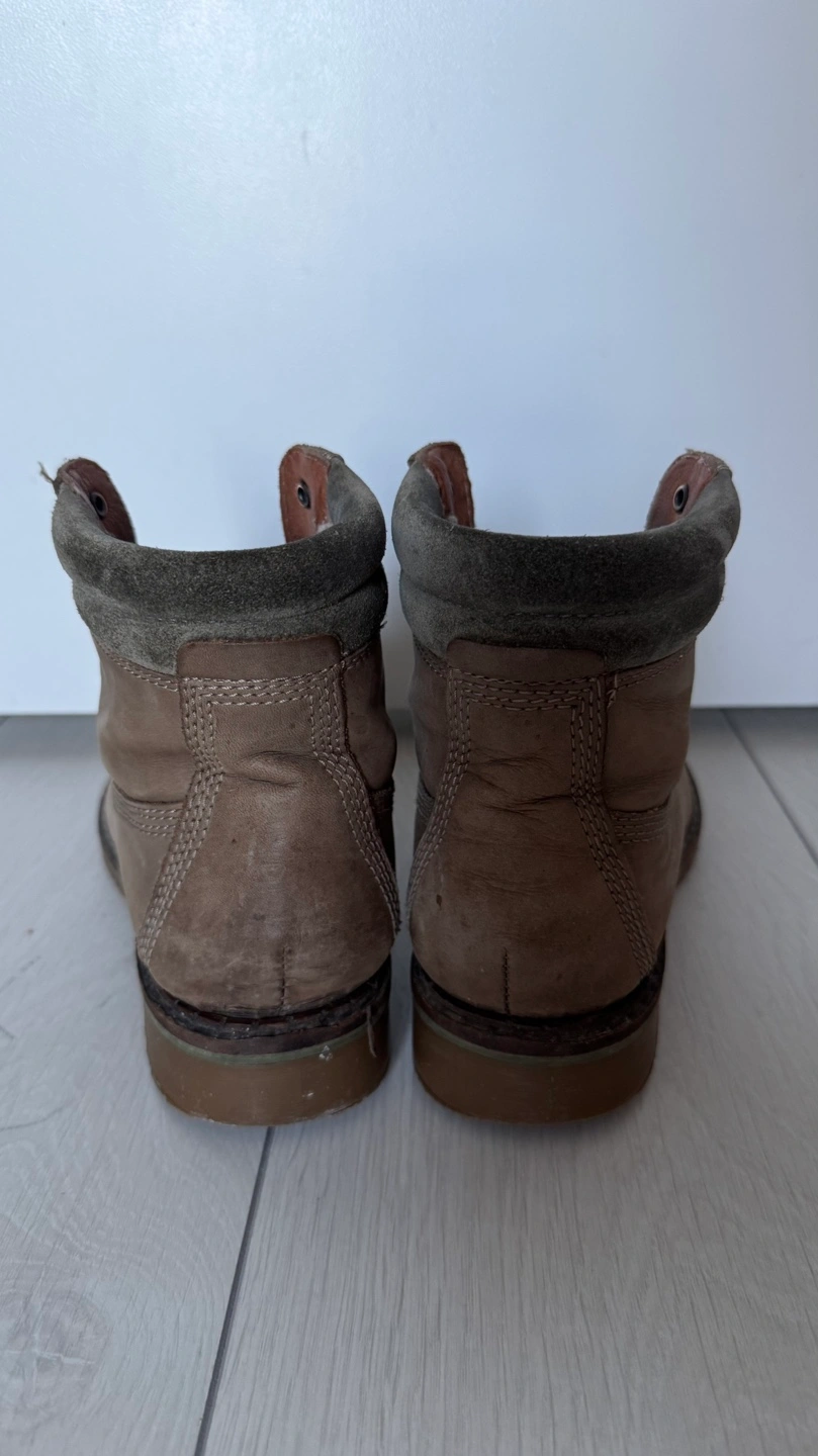 Size 38 (8) brown leather boots with a green suede collar. Lace-up style. Worn but in good condition. Trade it for a pack of paper towels😄