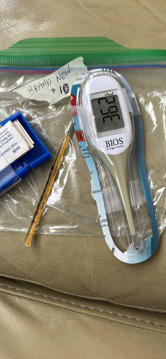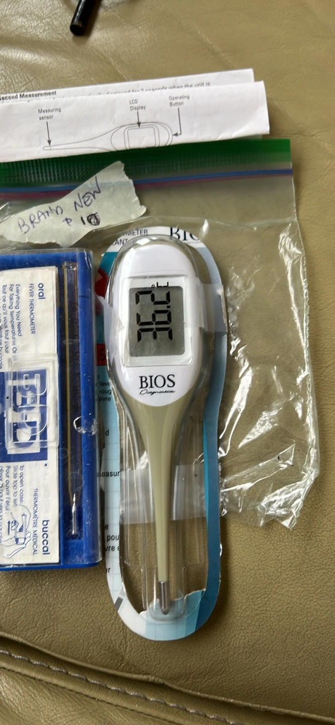 Digital thermometer with a clear LCD display. Includes a carrying case and a spare probe.