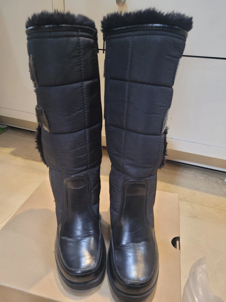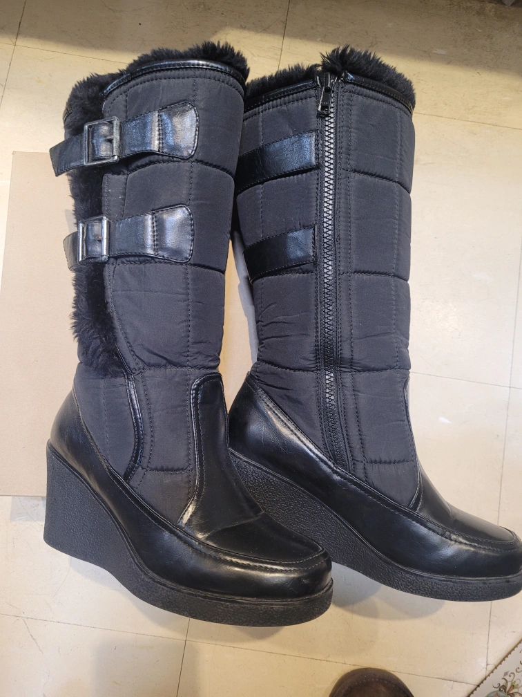 88Black winter boots with a wedge heel. They have faux fur lining and buckle details. Size 7