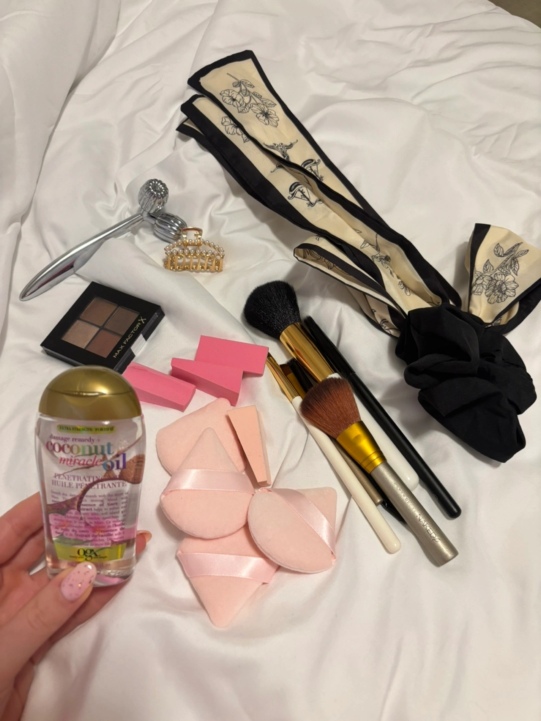 A bundle of makeup and beauty items, including a face roller, eyeshadow palette, makeup brushes, makeup sponges, hair scrunchie, and coconut oil.All goes together, pick up in Langley