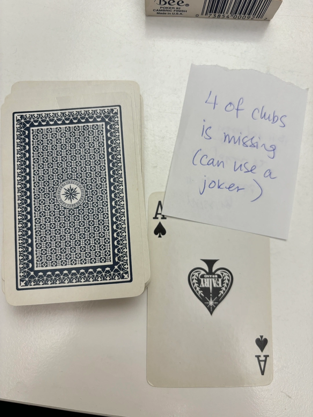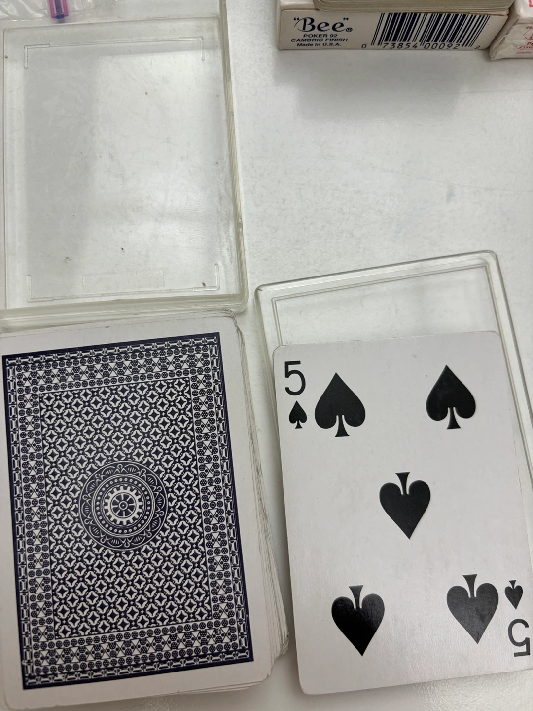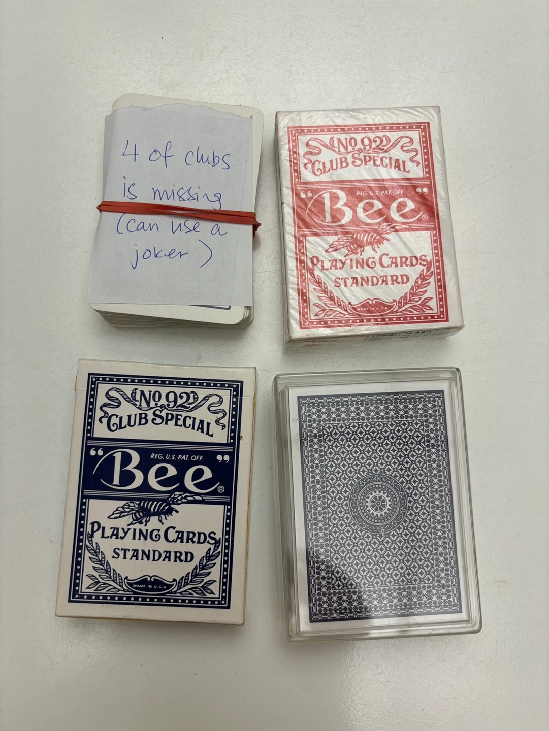 687Pick up at Dundas and River Selling a bundle of playing cards! - Two full decks of Bee playing cards, one BRAND NEW in plastic wrapping. - One deck is missing the 4 of clubs. - one full deck in a plastic case All cards are in good or new condition.
