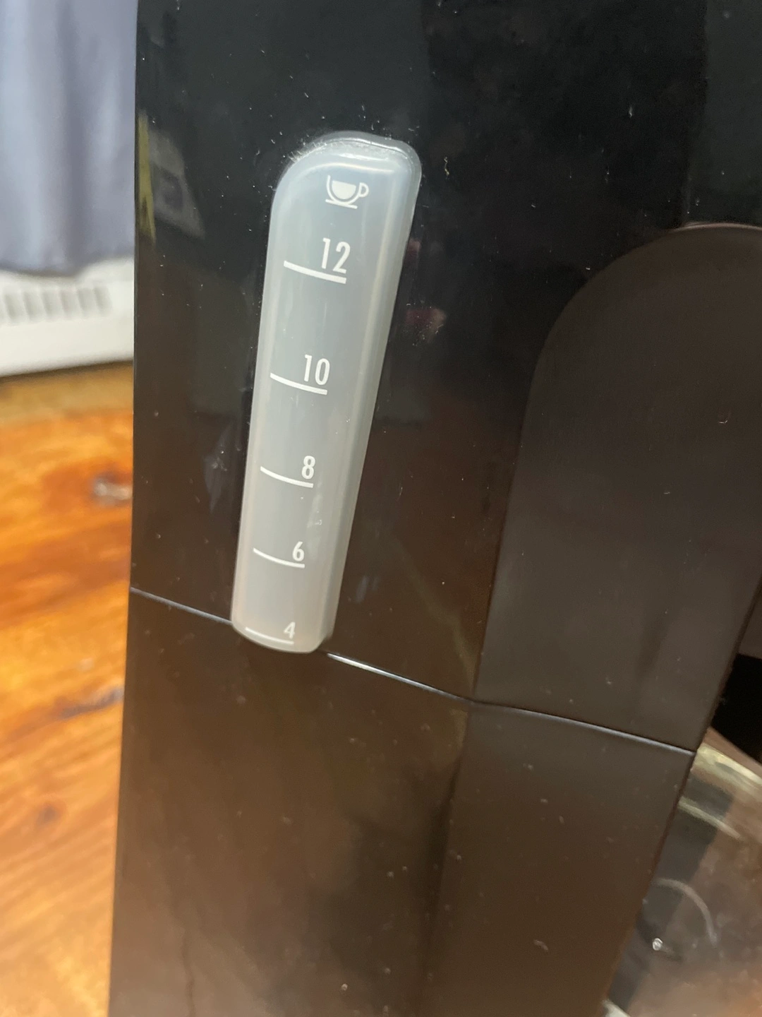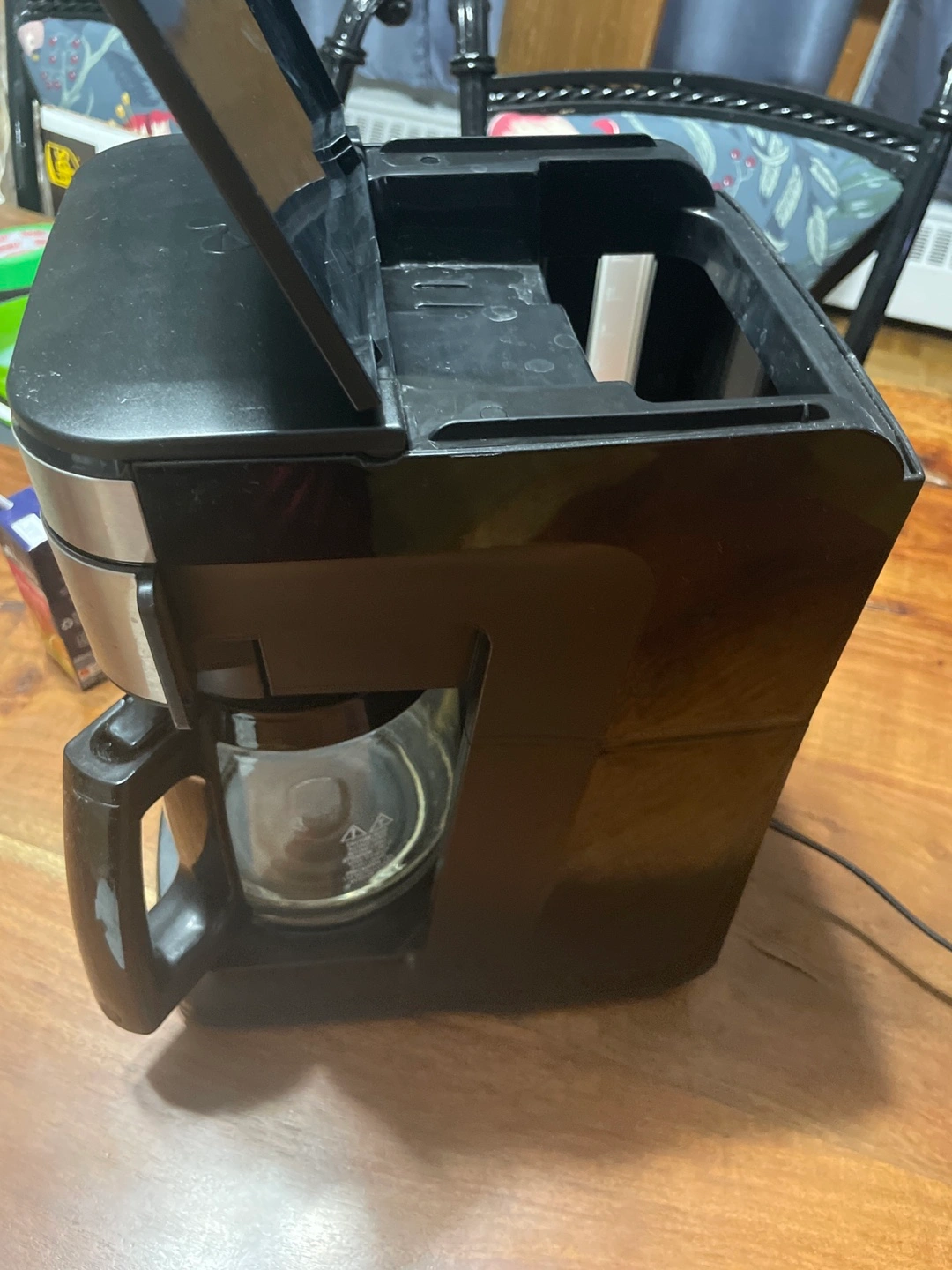 Black and silver coffee maker with a glass carafe.