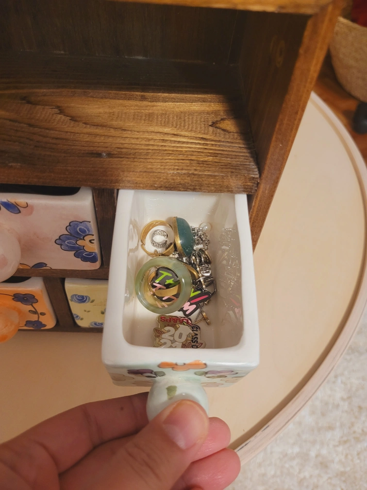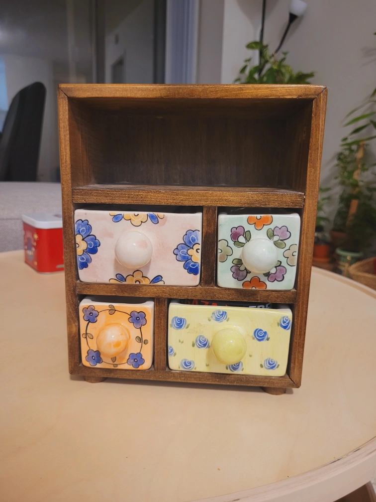Handmade. Perfect gift. Small wooden drawer organizer with four ceramic drawers. Ideal for storing small items like jewelry, or makeup.