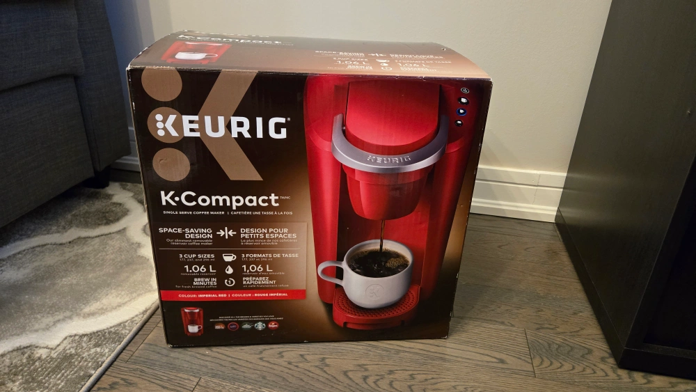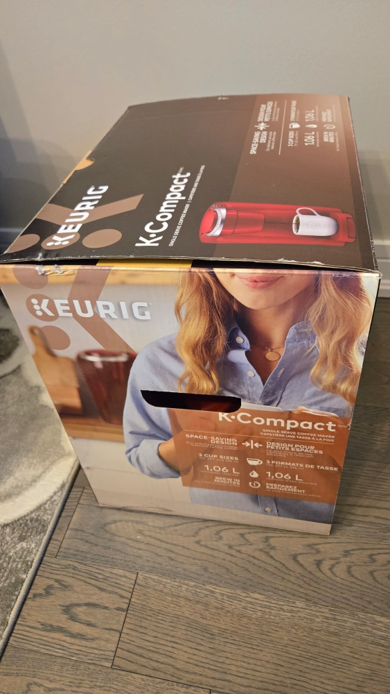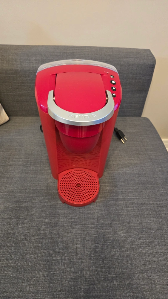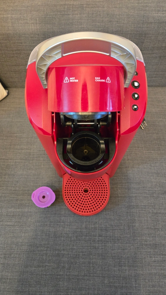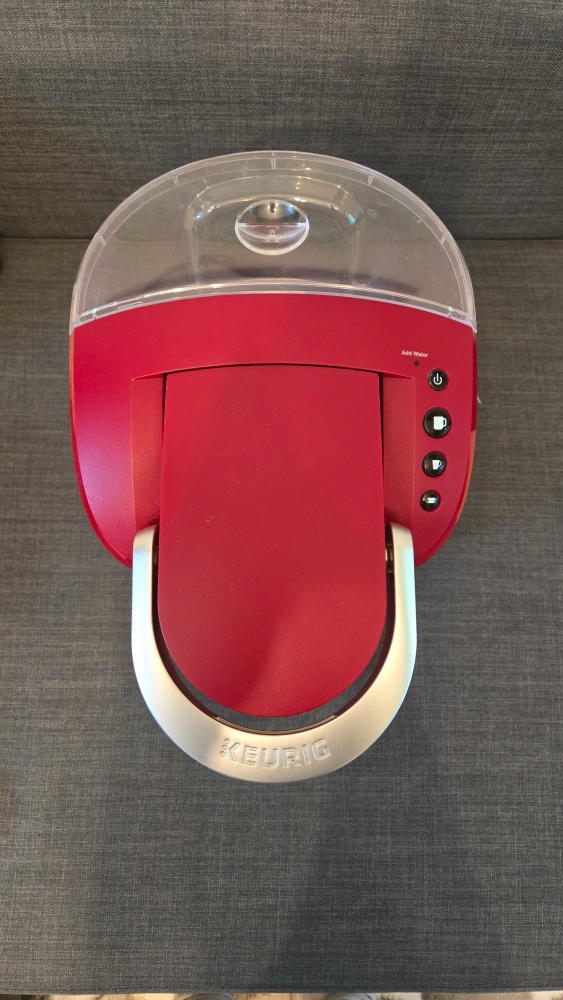 Red single serve coffee maker with a removable water reservoir. Makes 3 cup sizes. Includes original box and a refill pod