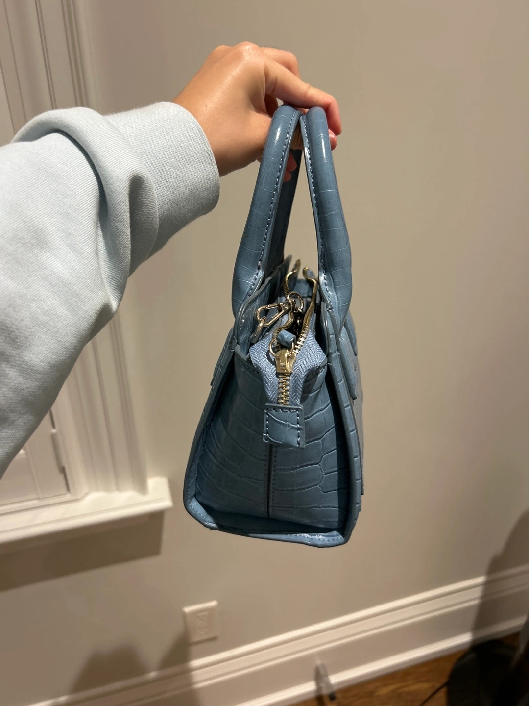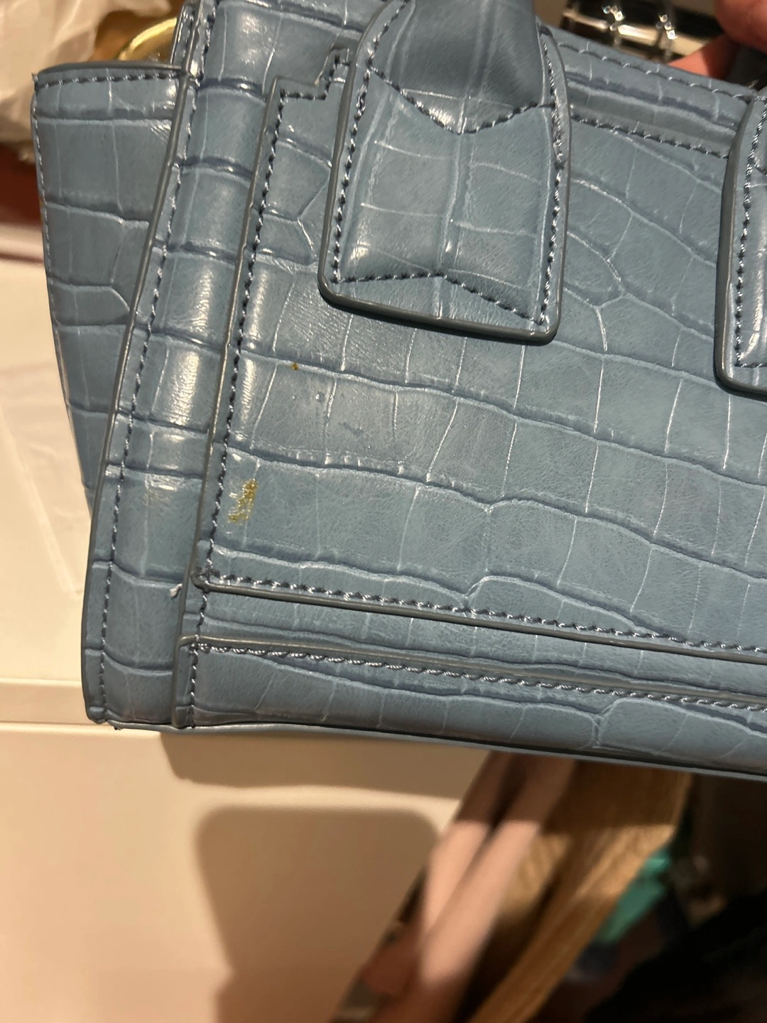 Small handbag with a chain strap. Features a crocodile-embossed design and top zipper closure. Small stain on one side.
