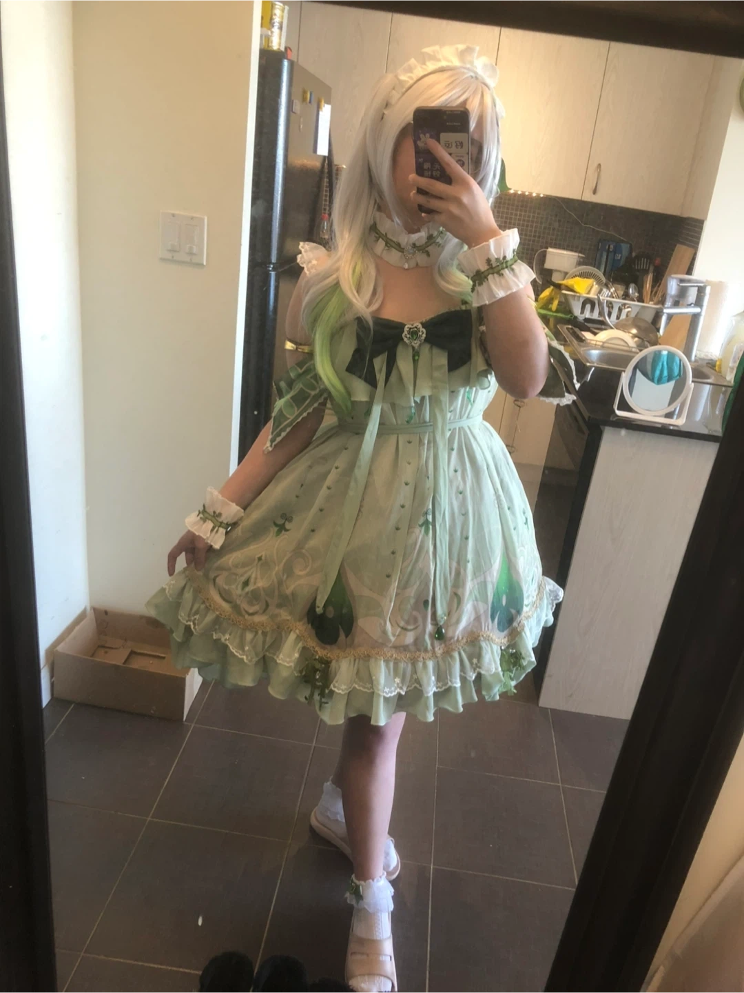 Green and white lolita dress with lace trim and a large green bow. Sleeveless with adjustable straps. Comes with a matching wig.