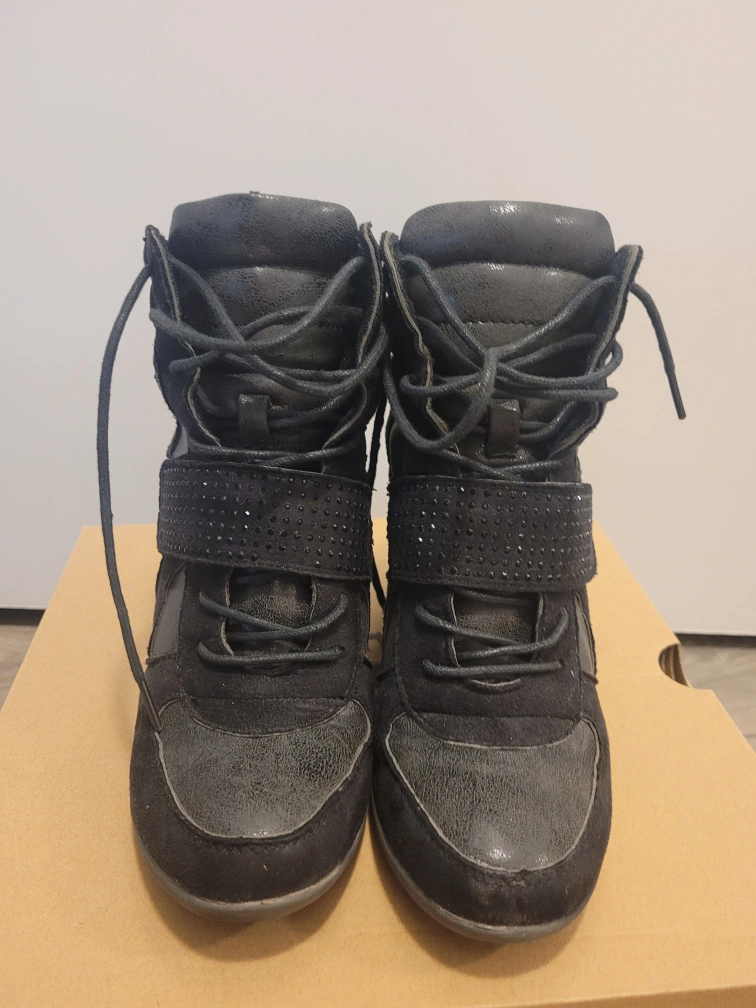 Black suede and faux leather sneakers with a wedge heel. Lace-up closure with a velcro strap. Rhinestone detail on the strap.