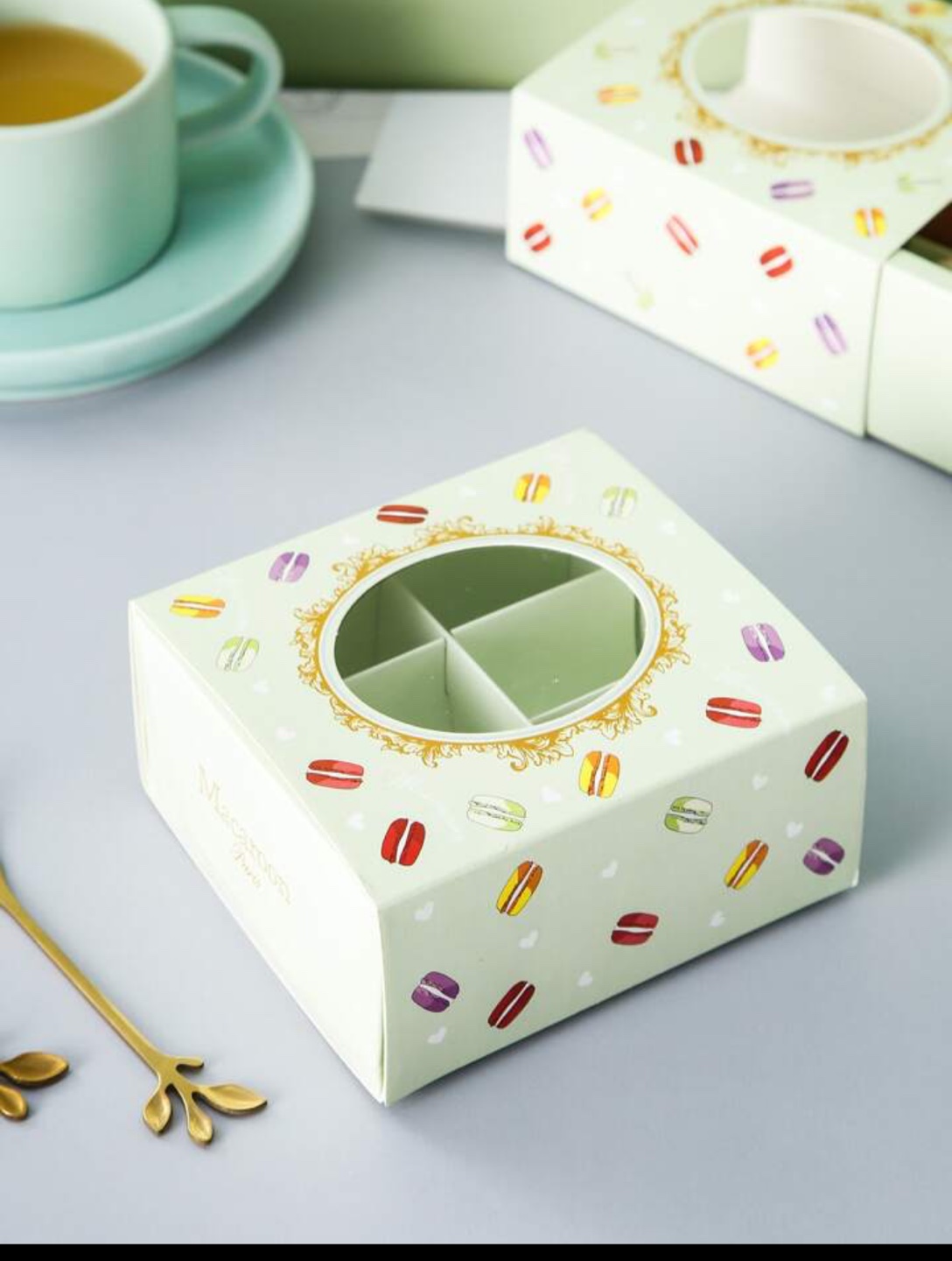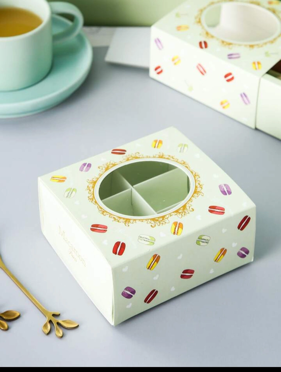 Mint green macaron boxes with a clear window. Six individual compartments. Perfect for gifting or selling macarons.