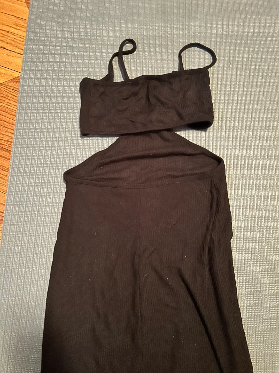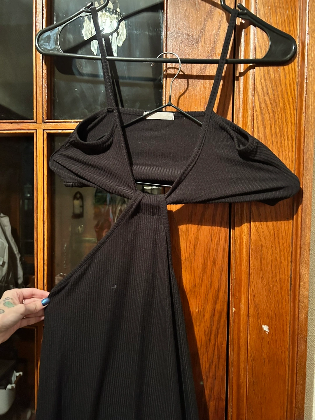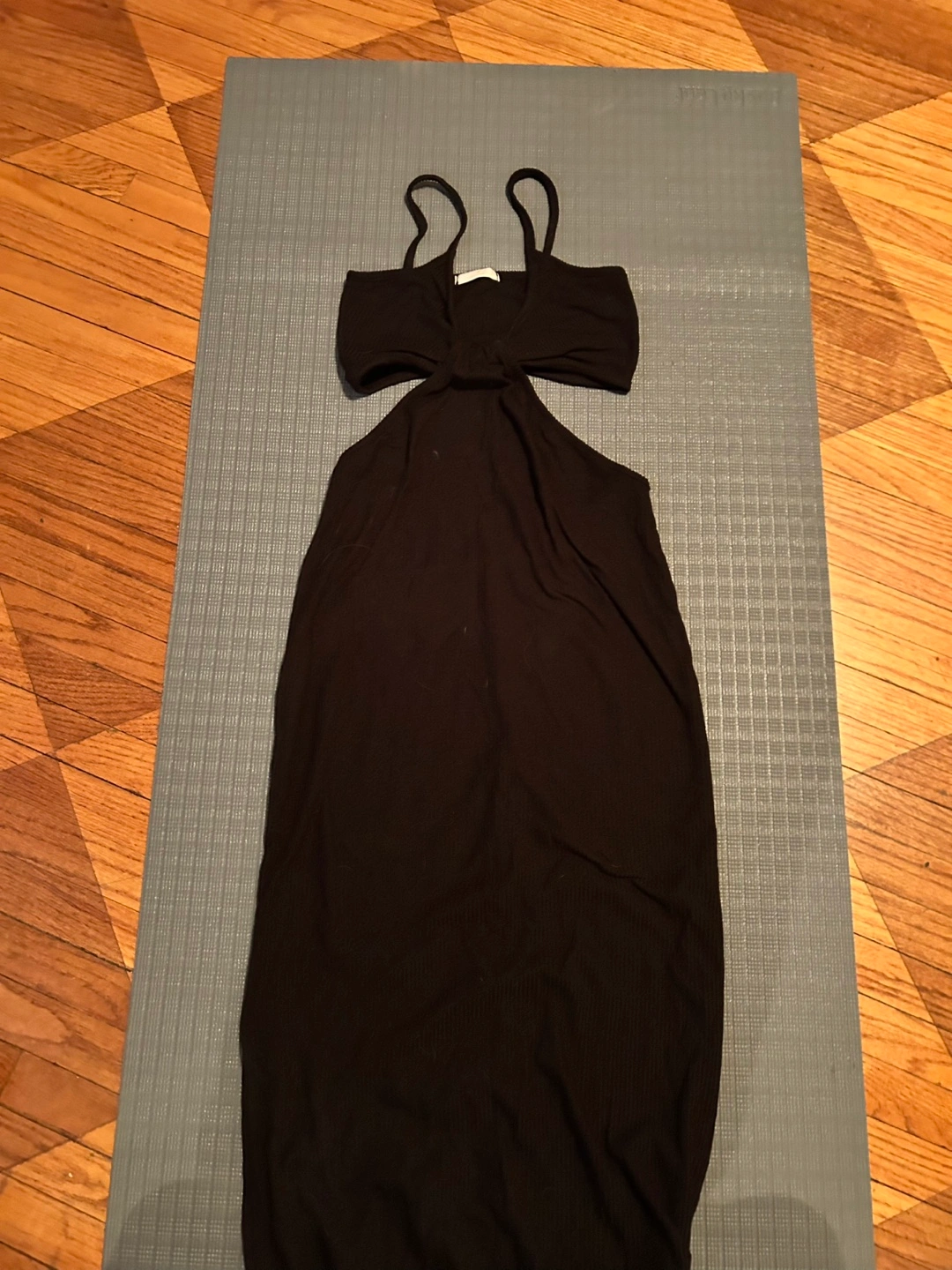 Black maxi dress with a cutout detail at the waist and a knotted top. With thin adjustable straps.