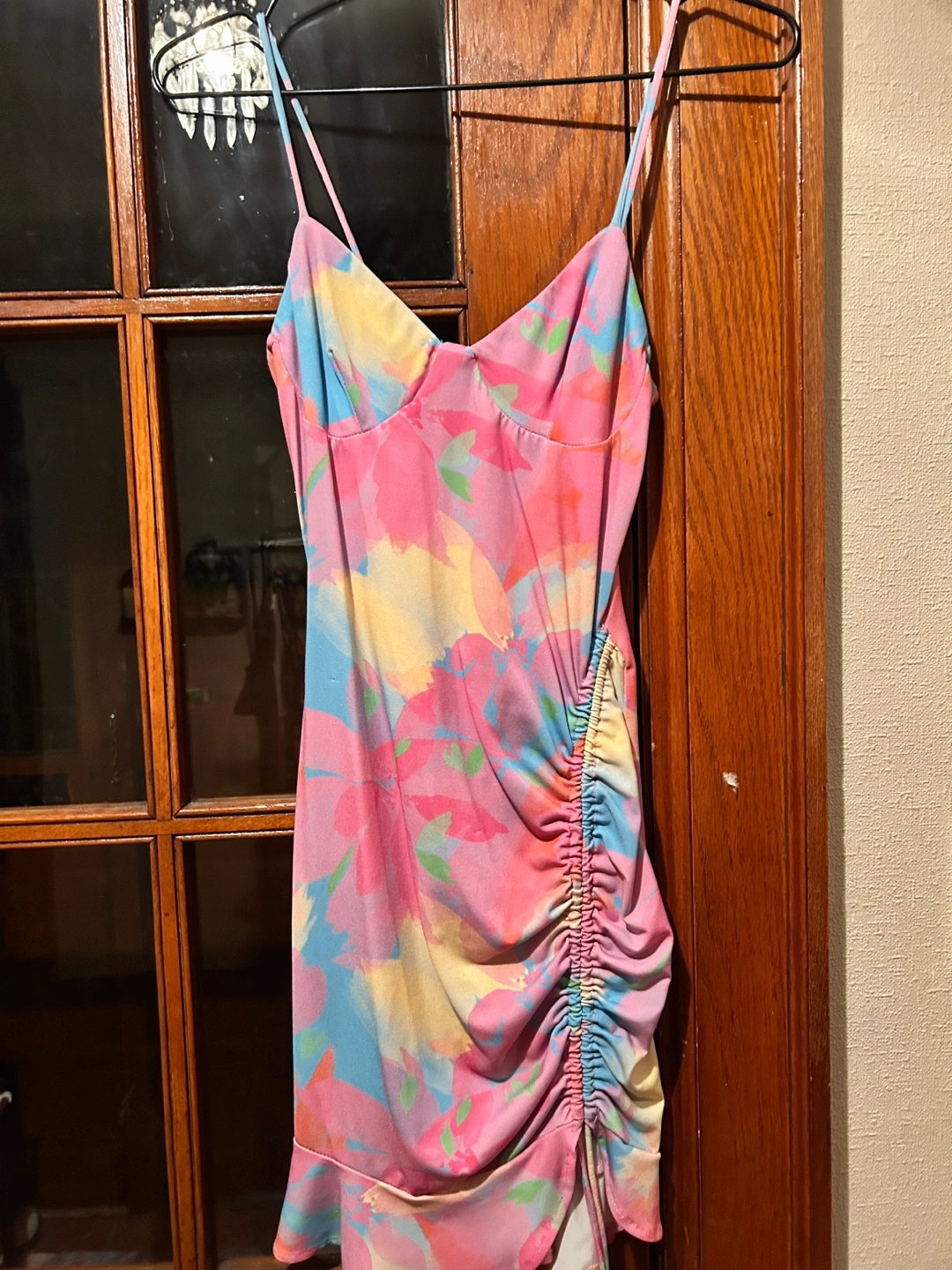 Pink colorful mini dress, stretchy, with strings that adjust the side of the dress.