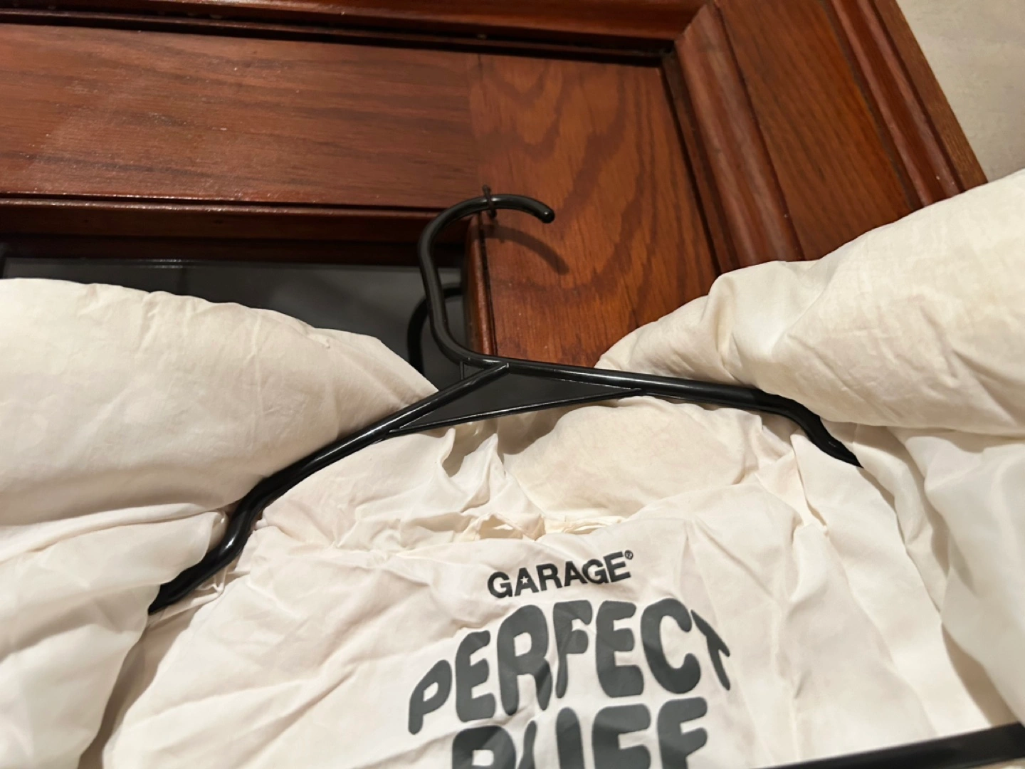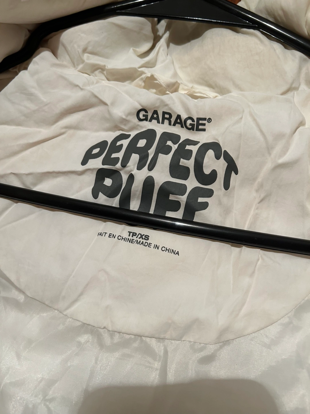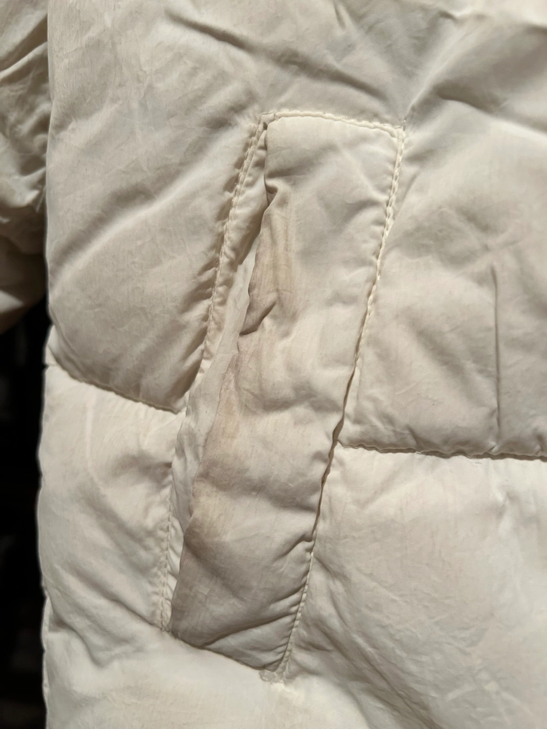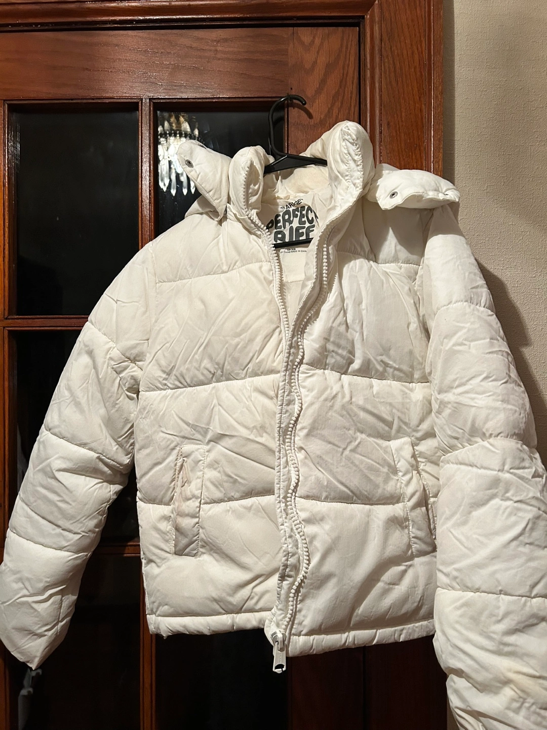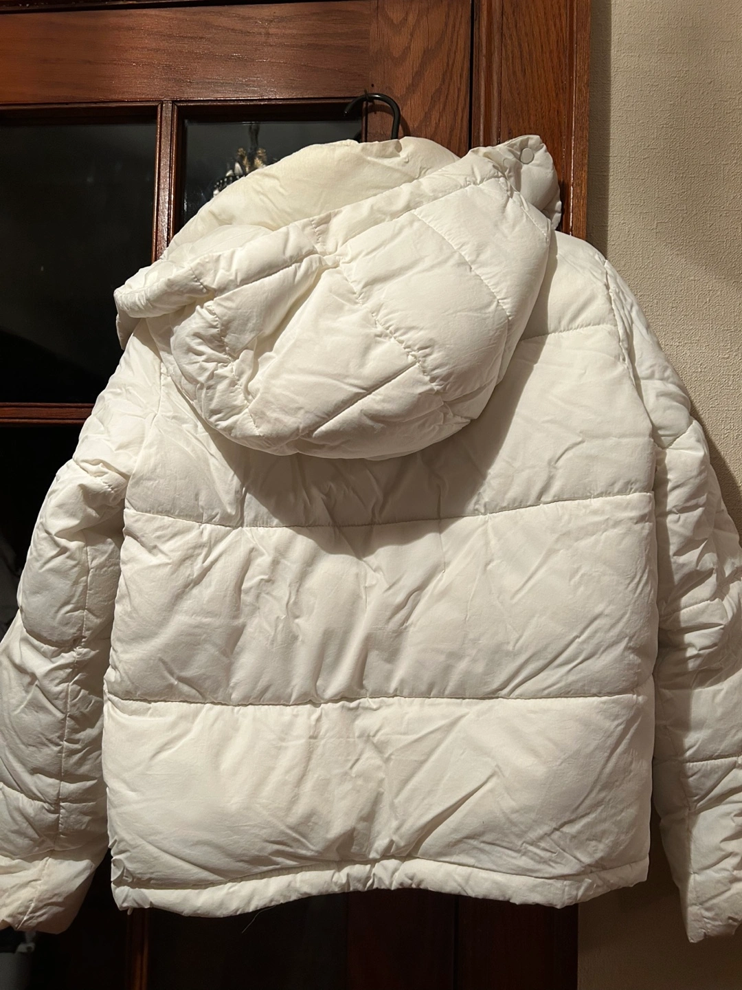White puffer jacket with hood. Small stain on one pocket and neck but might come out.