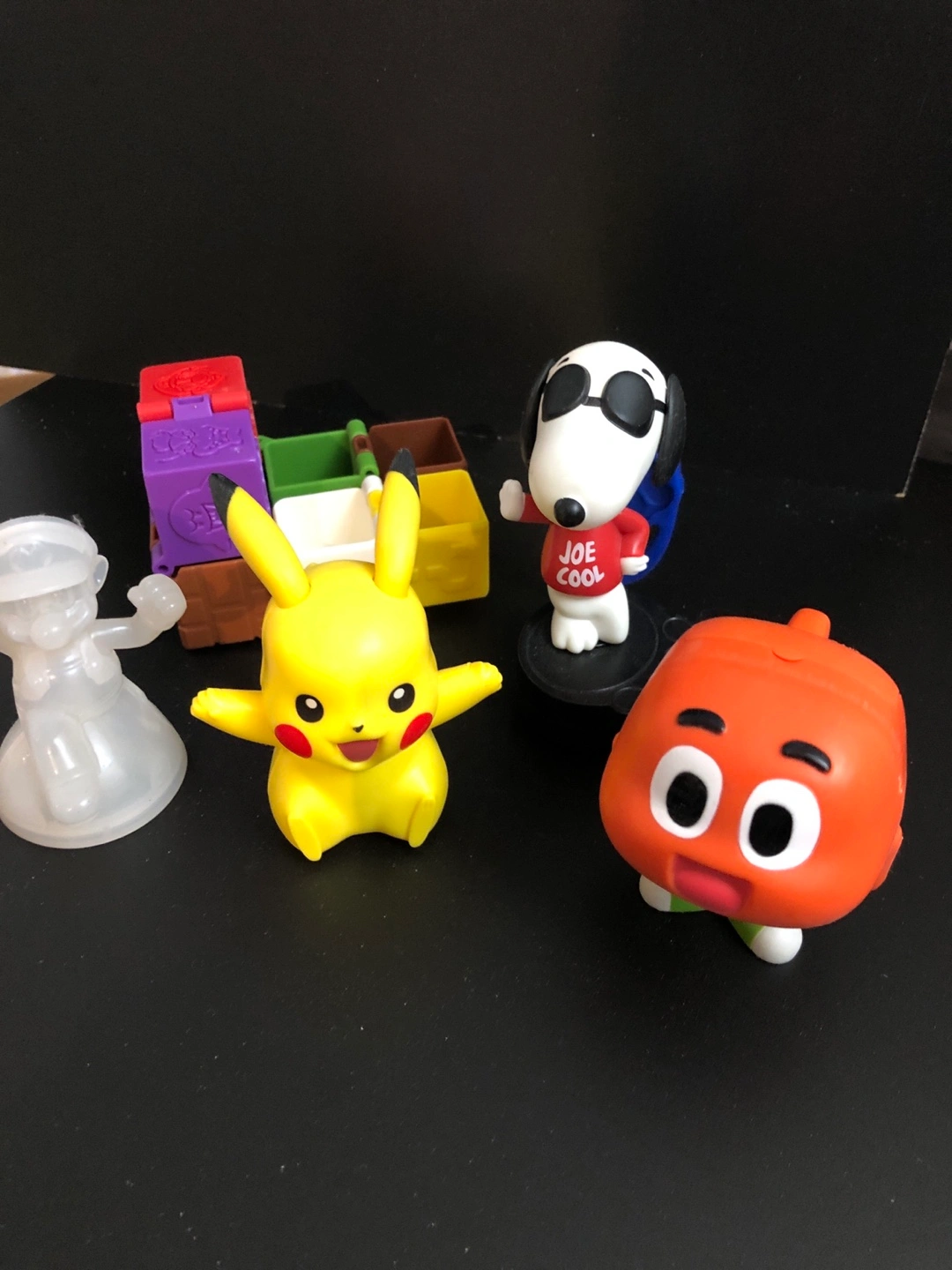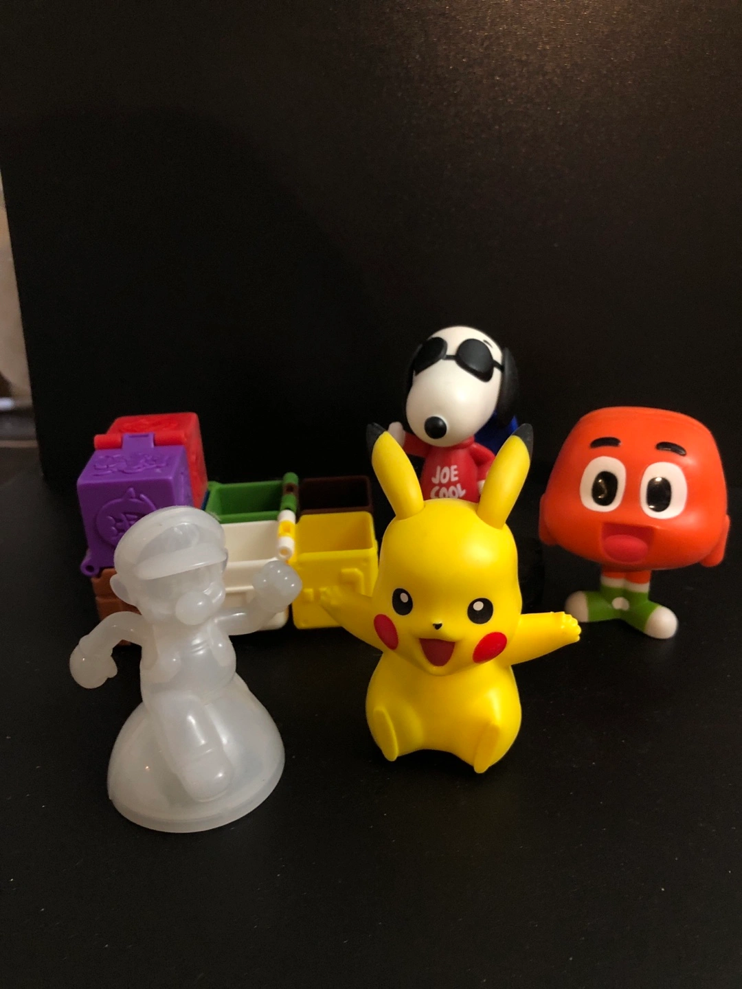 Set of four Happy Meal toys. Includes Mario, Pikachu, Snoopy, and a red character.