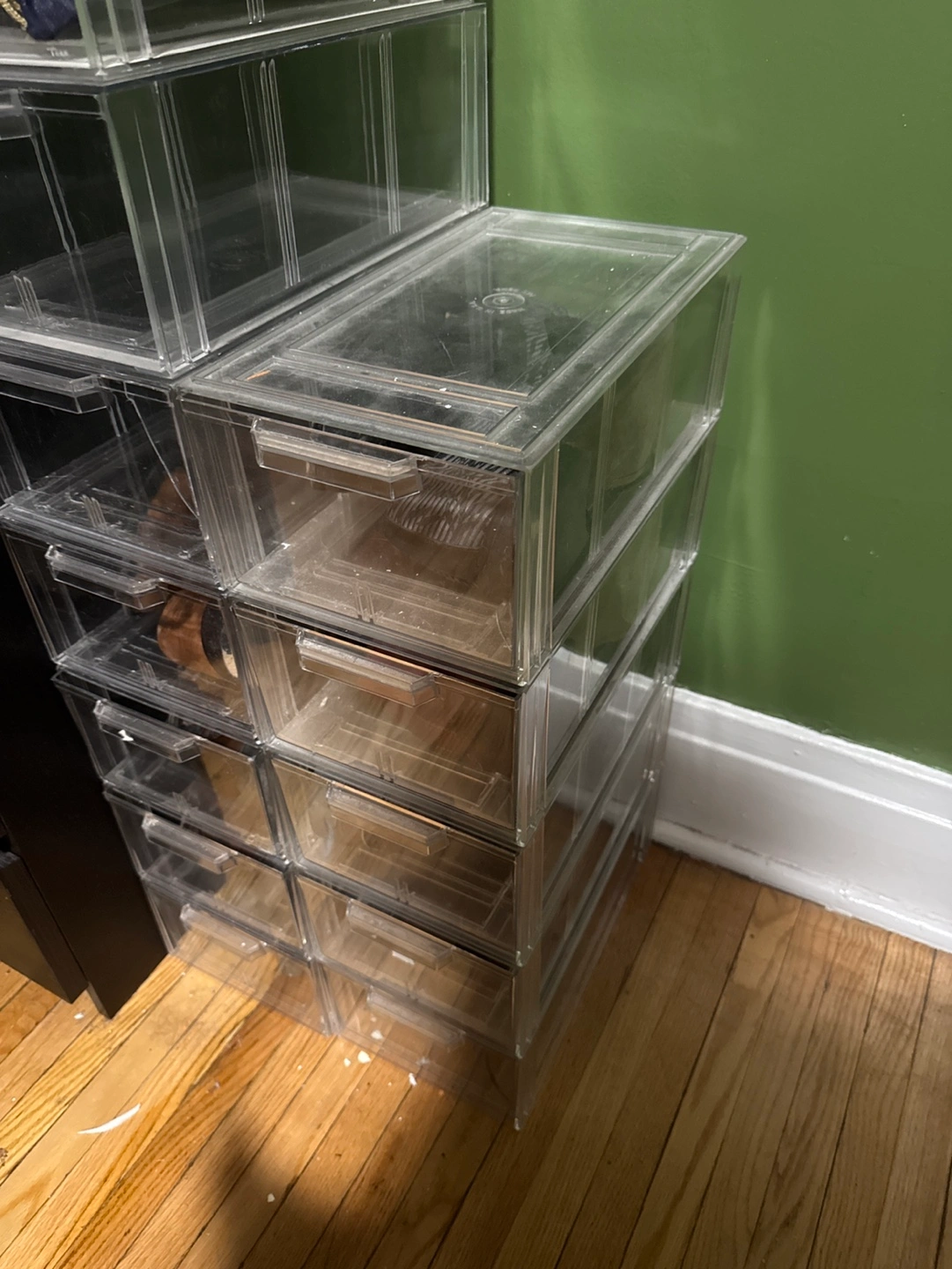 1755 clear plastic storage drawers with sliding drawers. Great for organizing small items, like shoes