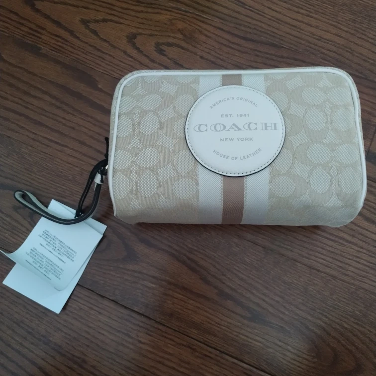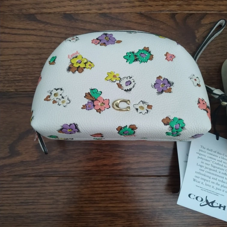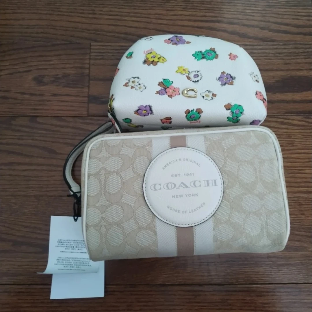 1000+Two Coach makeup bags. One has a floral print and the other has the signature Coach pattern. Both have a zipper closure.