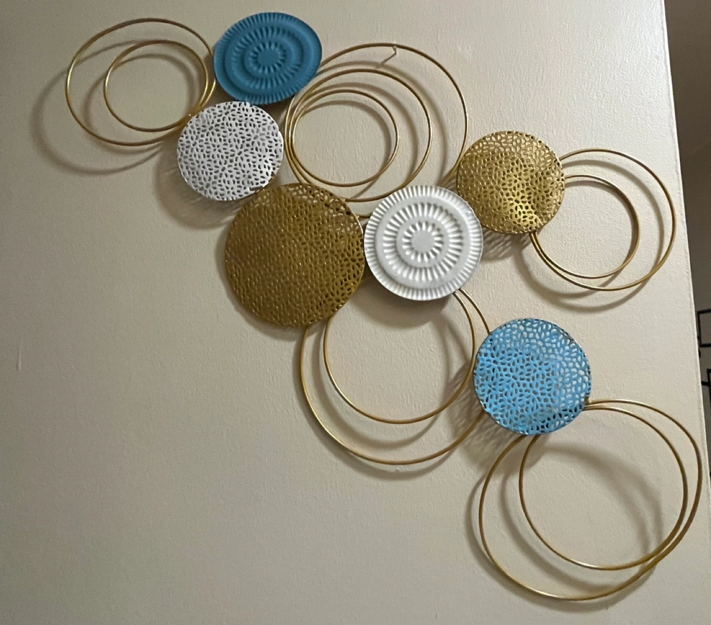 Gold, blue and white metal wall decor with various circular shapes and patterns. I have encircled the dent area and tiny damage. Item never used.