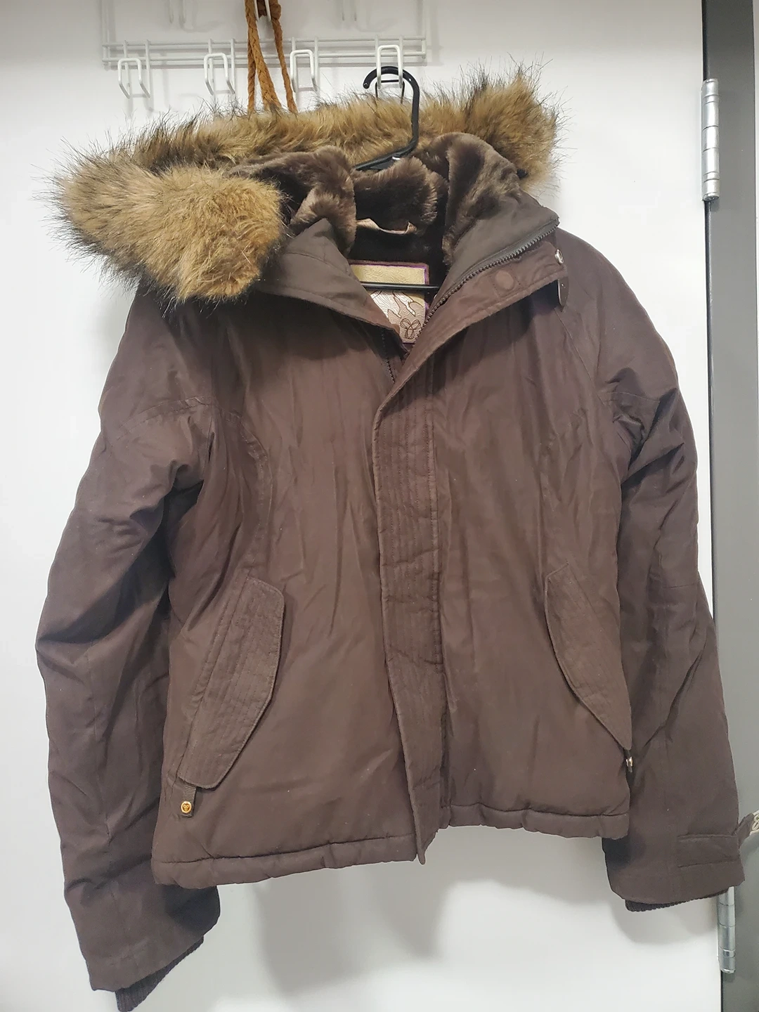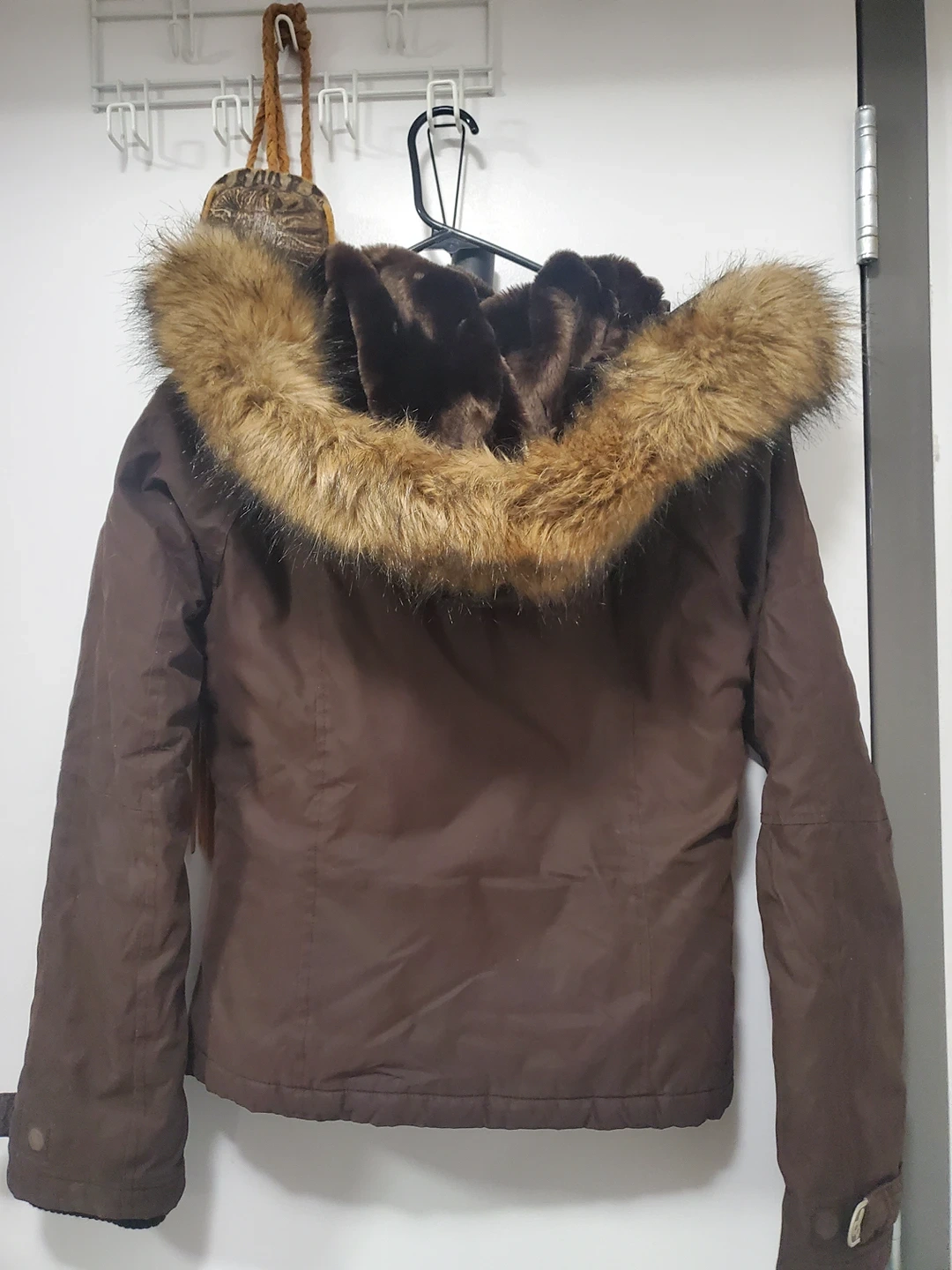 Aritzia TNA jacket. Size Medium. brown, real fur around removeable hood. Very warm. Bought for 250. Pick up Front and Cherry.