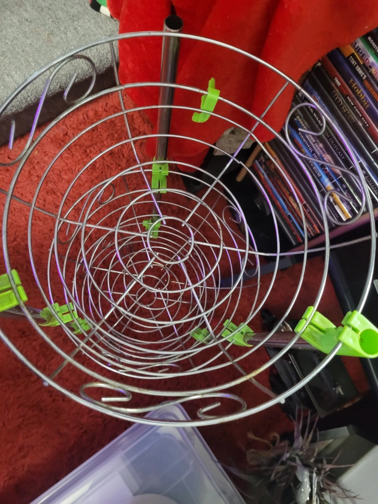 Three-tier wire stand with green clips. Metal construction. one clip broke, as seen in pictures. this does not affect the stand all. still sturdy, and no rust. great for potatoes and onions.