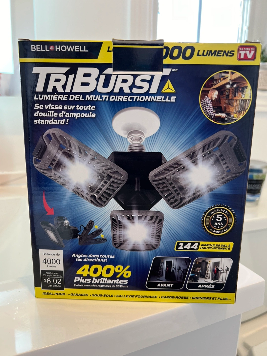 Multi-directional light, 4000 lumens, 144 LEDs, 400% brighter than standard bulbs. Screws into a standard light socket. Ideal for garages, basements, workshops, closets, attics, and more. 2 brand new in box, never used.