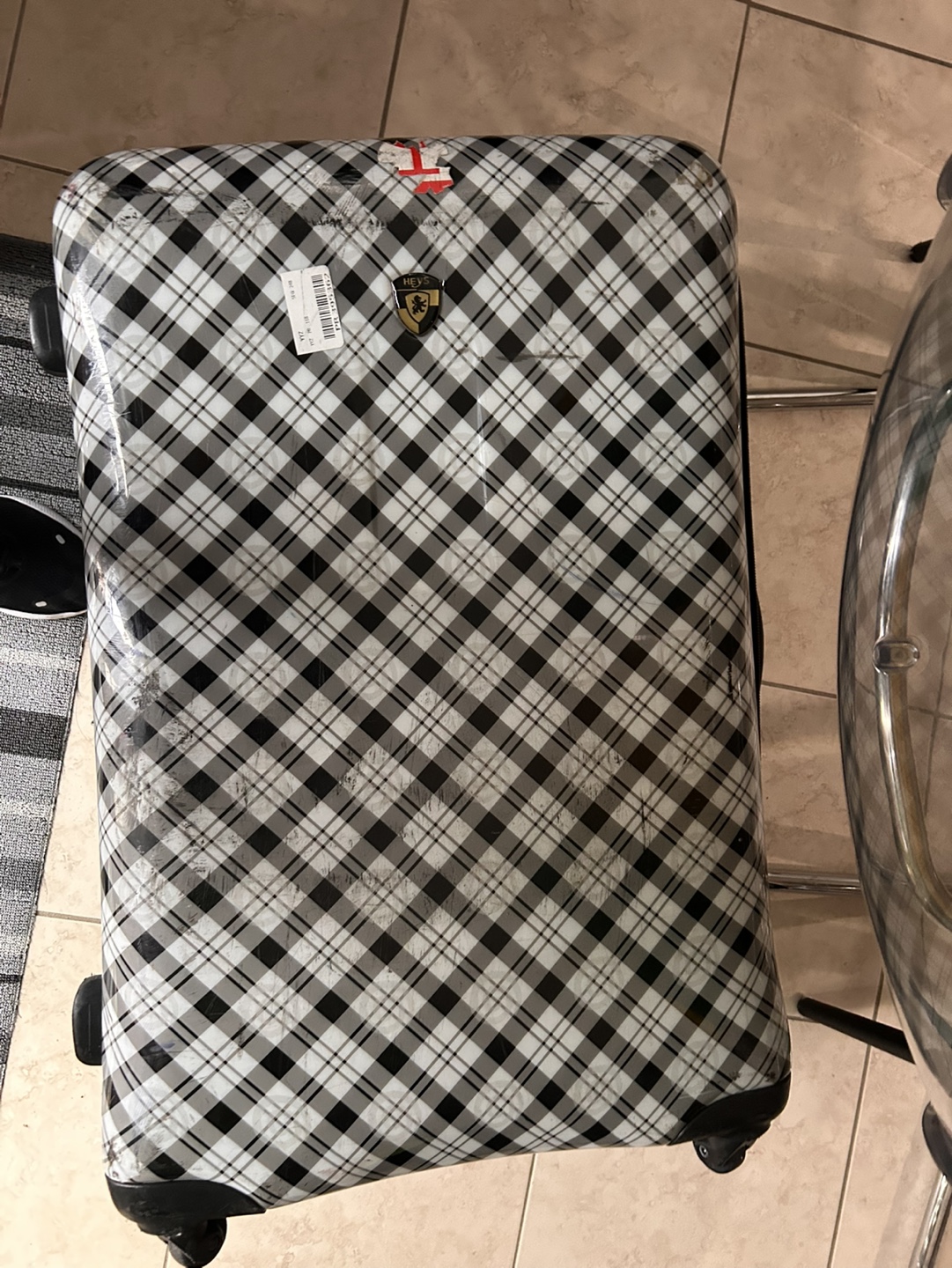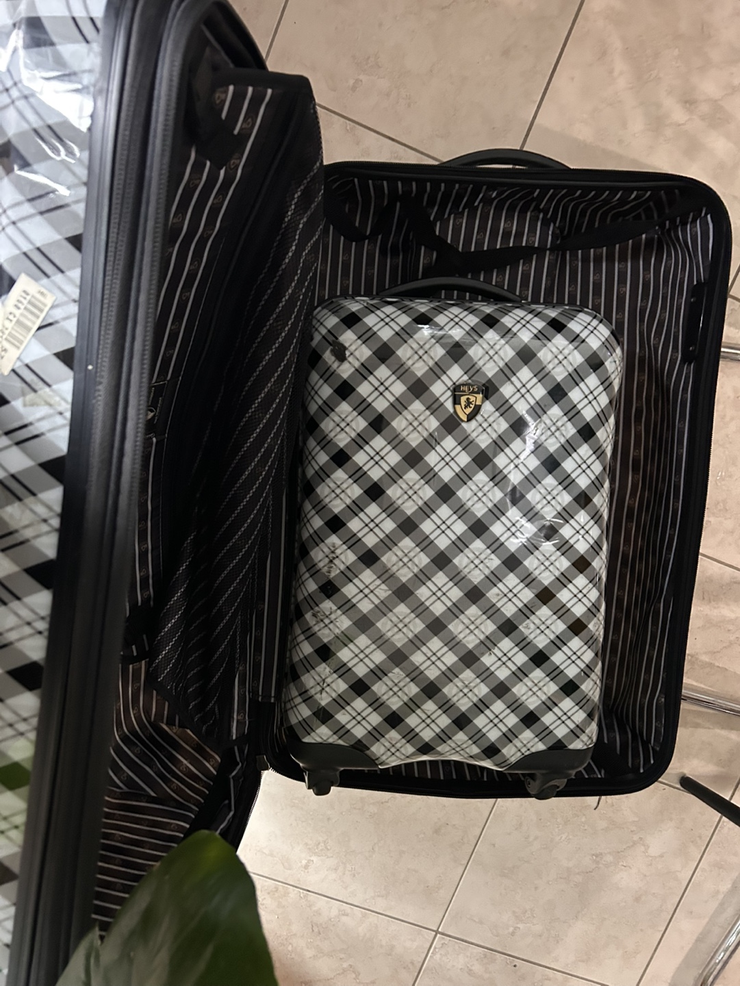 Black and white luggage set, two pieces. One larger suitcase, one smaller carry-on size suitcase. Both suitcases are hard-sided with a black and white checkered pattern.