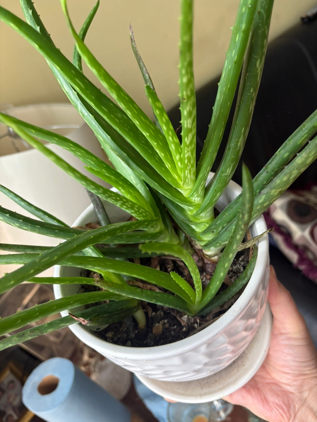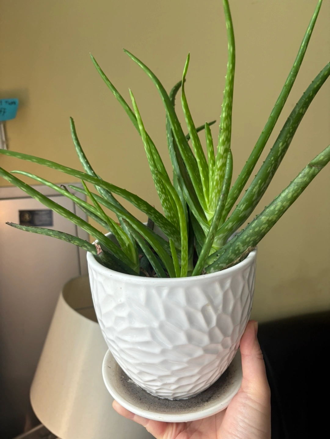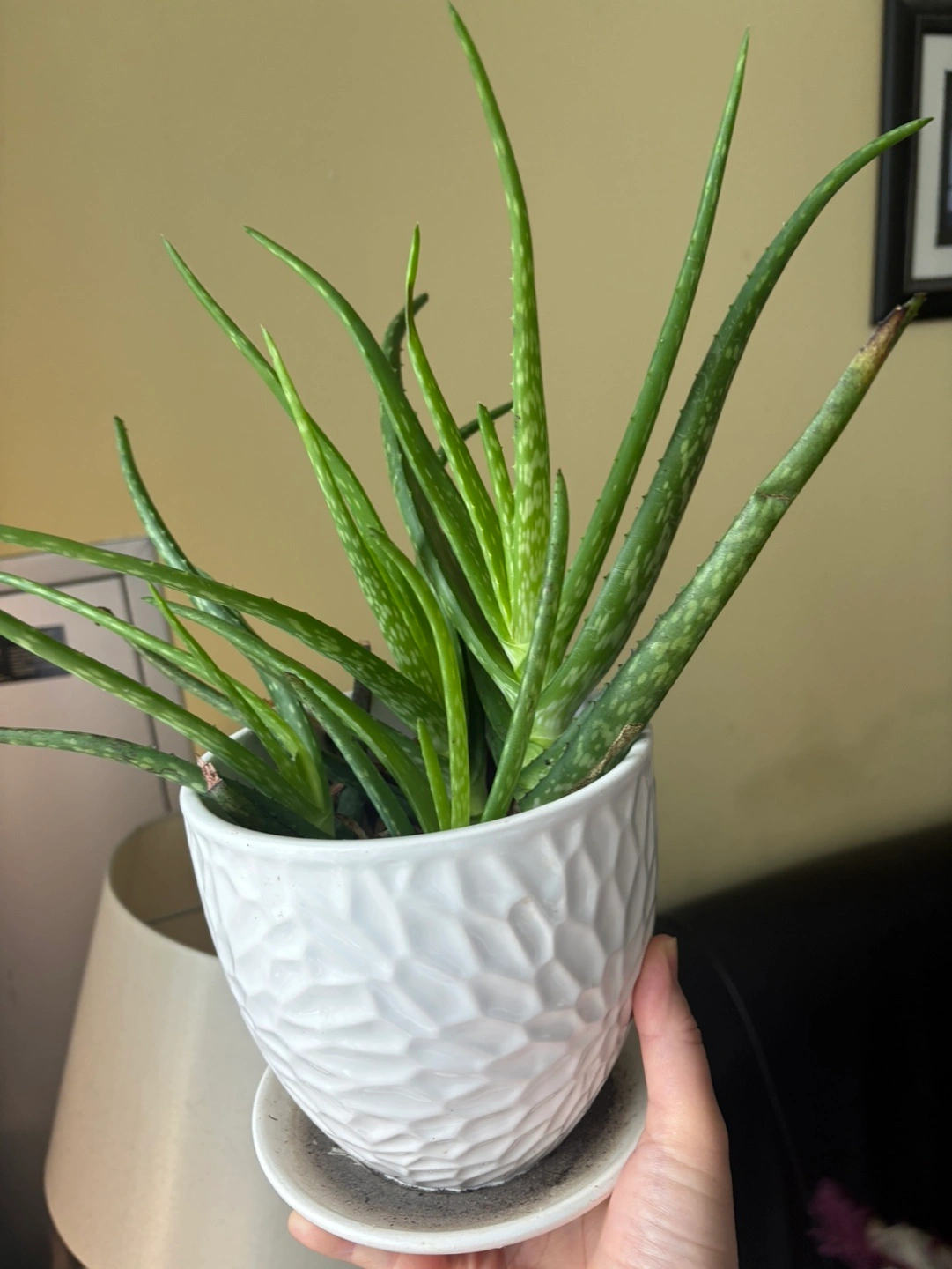 936Healthy aloe vera plant in white pot with saucer. Several pups are growing. 2 big and 2 small.