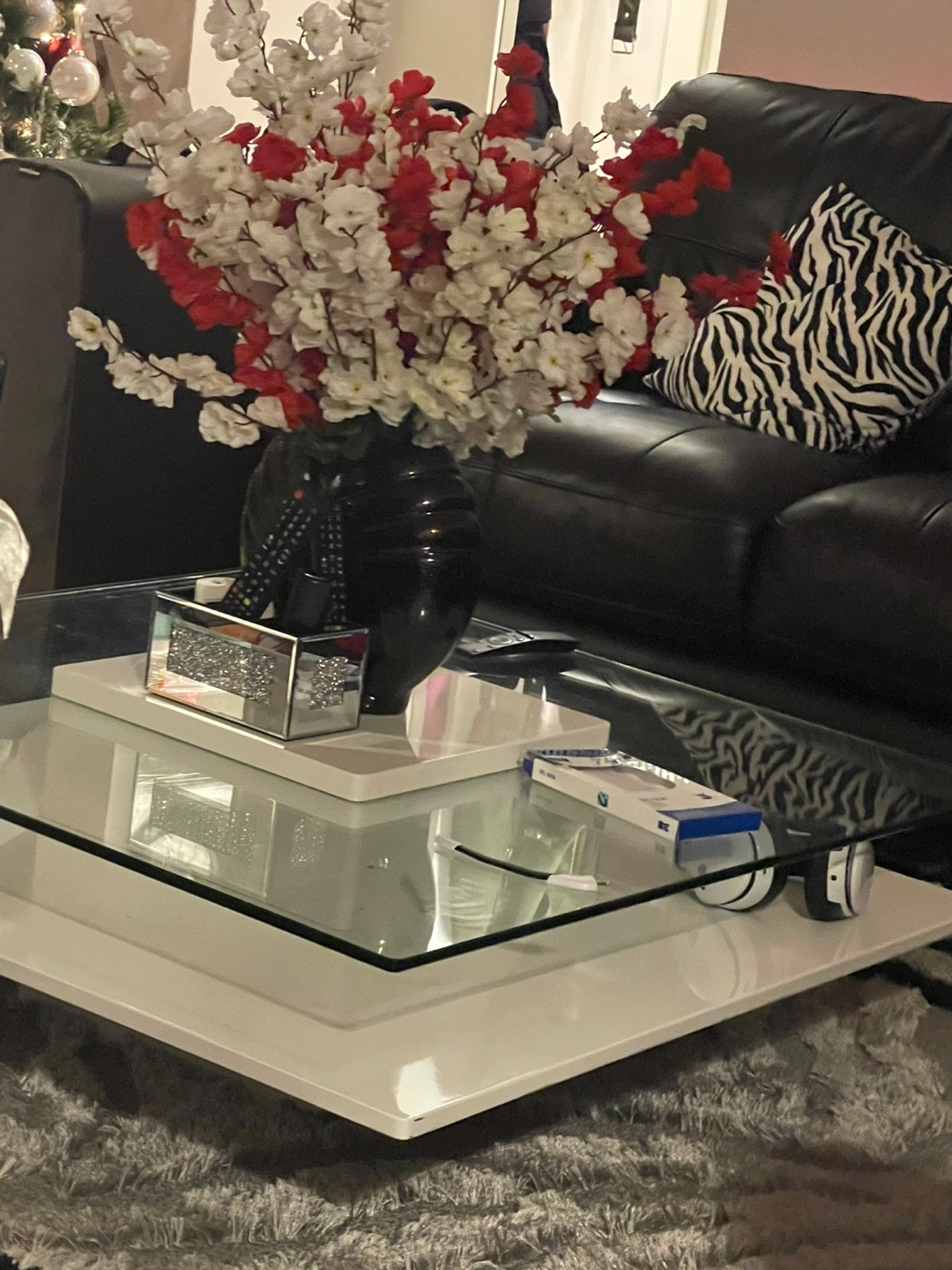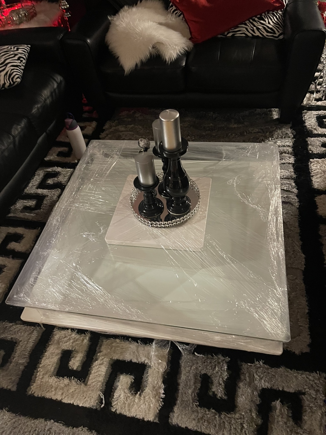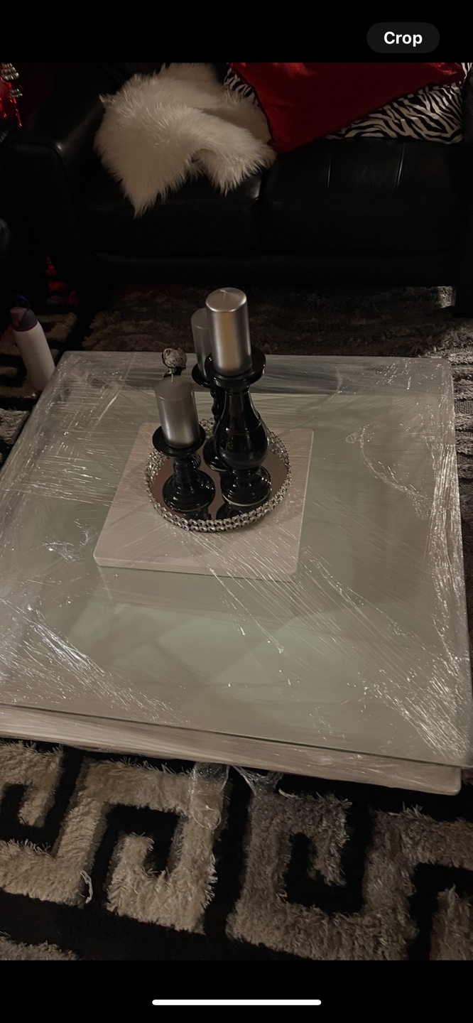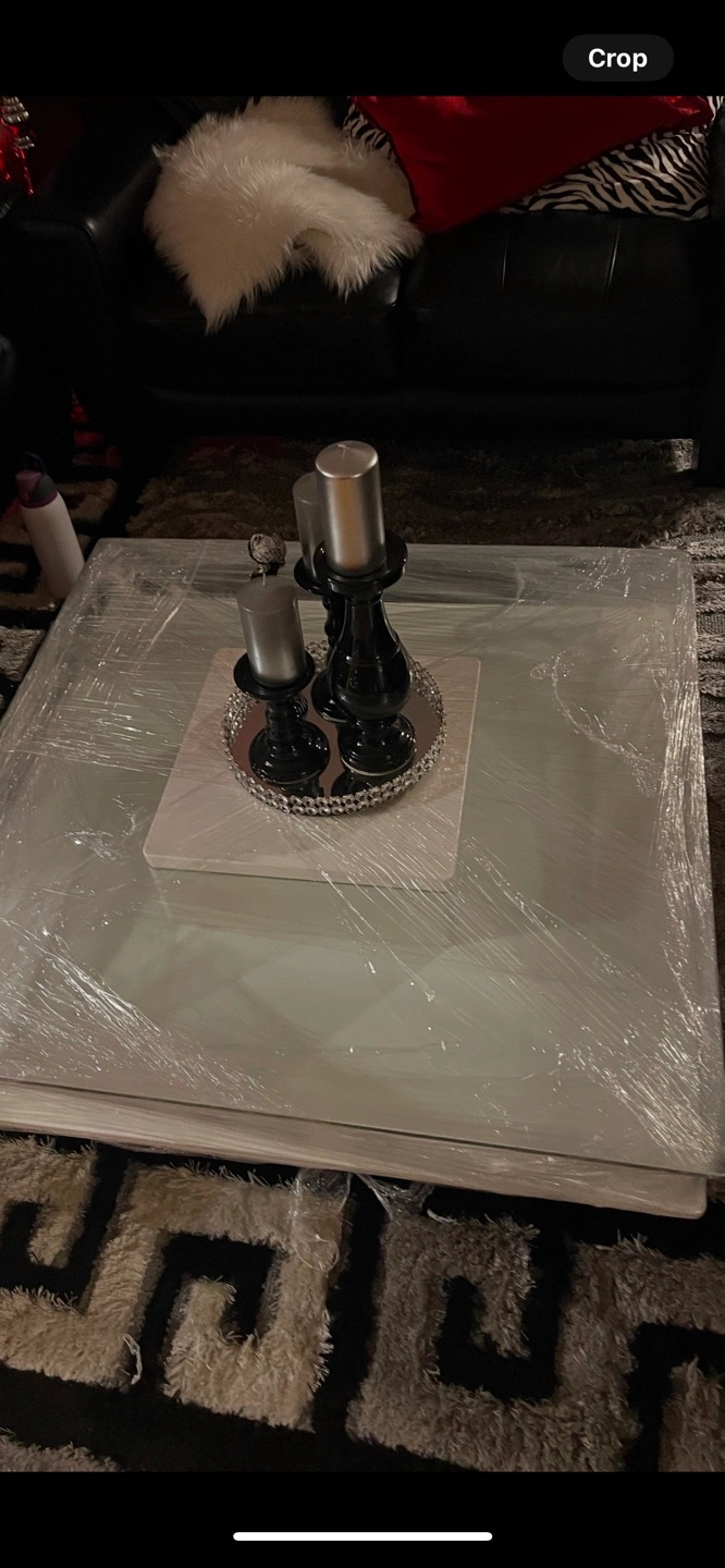 Square glass coffee table with white base. It has a glass top that is raised above the base. It is in excellent condition and for pick up only coffee table only as is