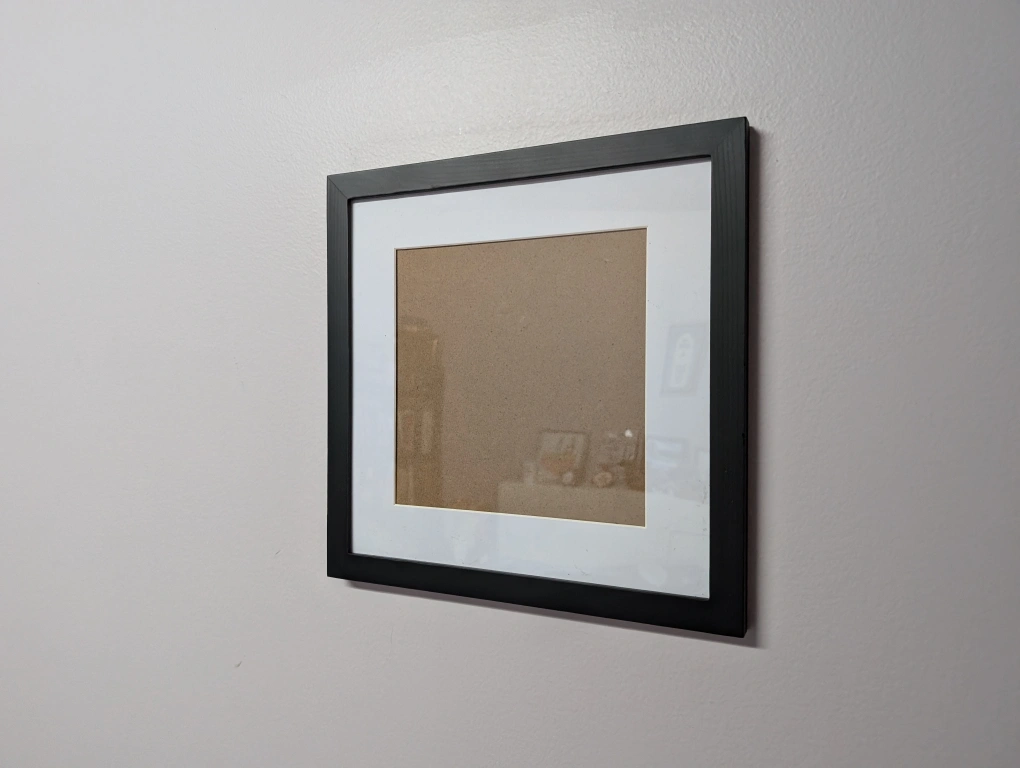 A set of 4 black picture frames with white mat. Can be hung on the wall or placed on a tabletop. Some minor scratches on plexiglass.