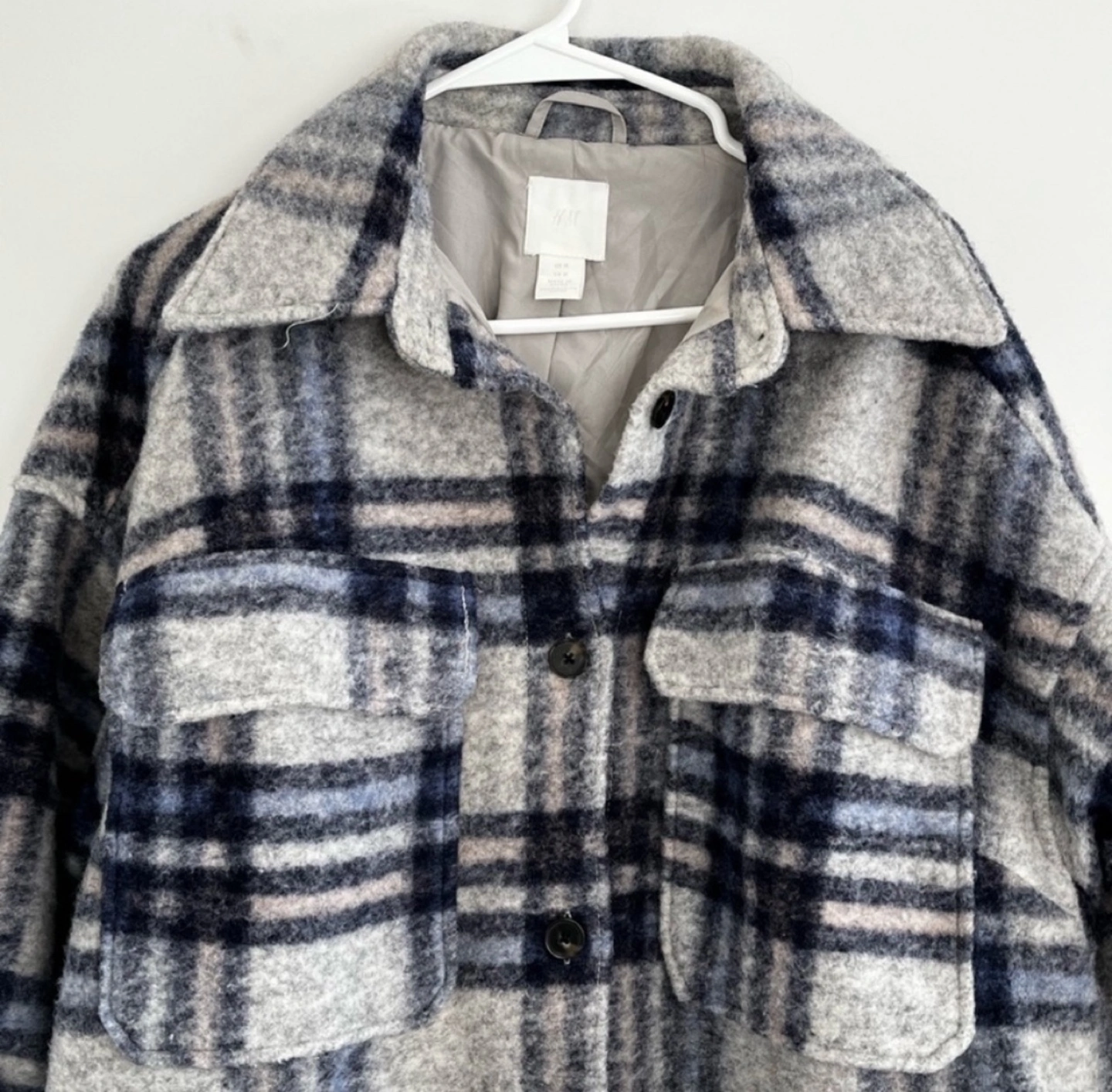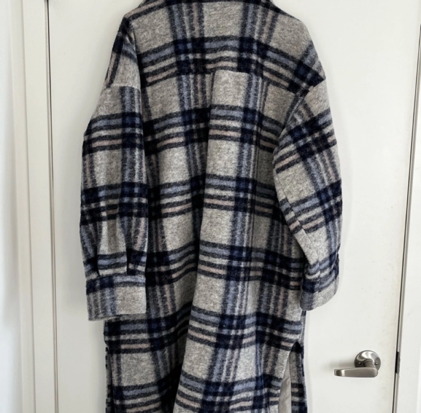Grey & blue plaid shirt jacket. Longline fit, button front, and two front pockets.