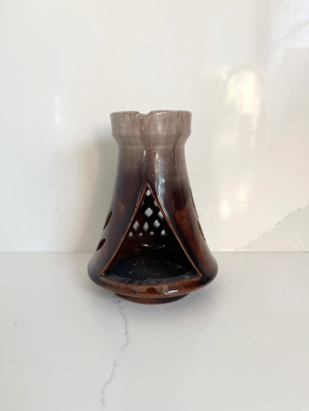 Brown and white ceramic diffuser with cutouts. Place essential oils or wax at the top and tealight in the bottom to heat up and fragrance your space.
