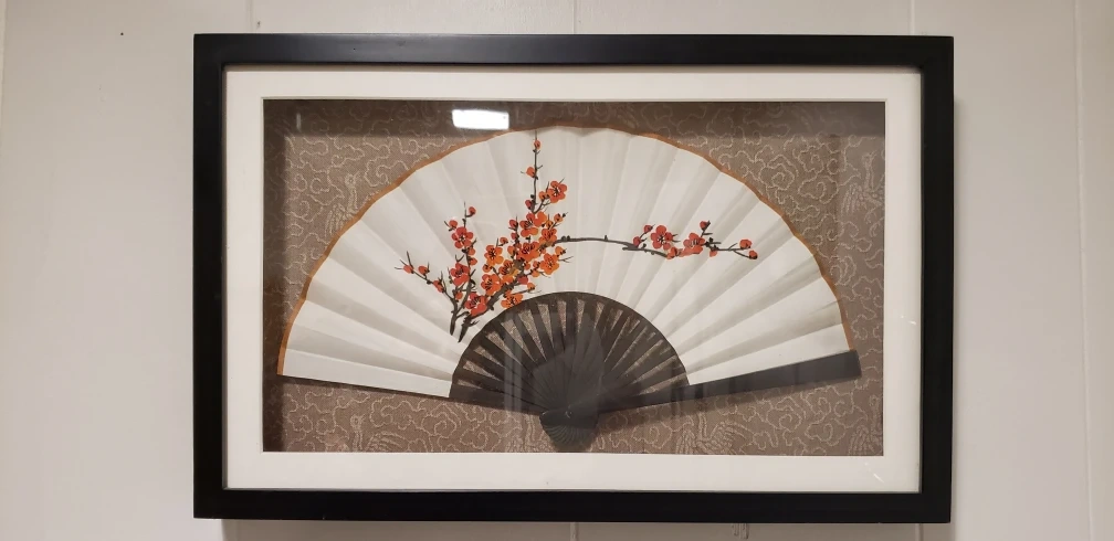 Framed hand fan with black frame and glass. Features a white fan with red flowers. made in Japan