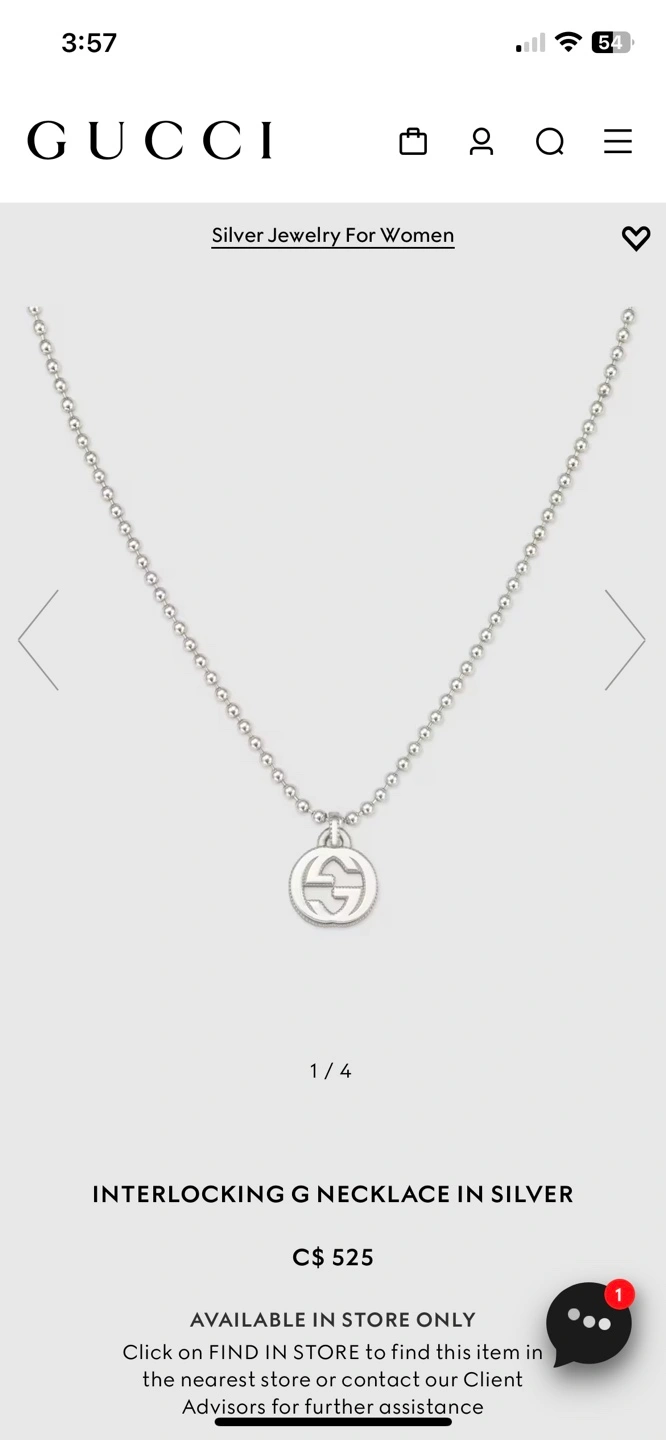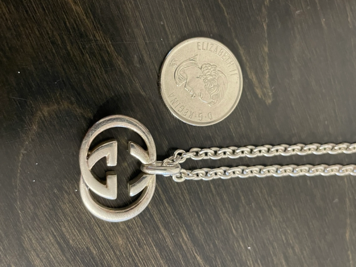 Authentic Gucci 925 silver necklace featuring a double G pendant. Chain is approximately 18 inches long.