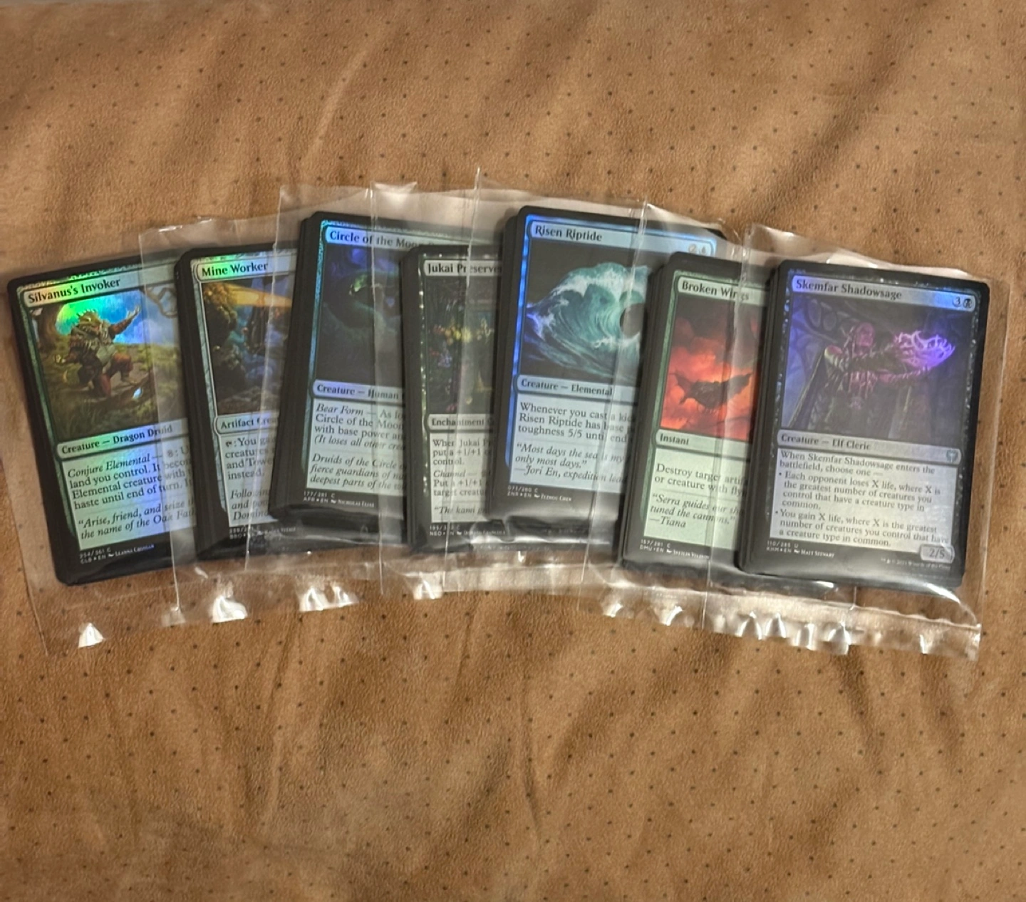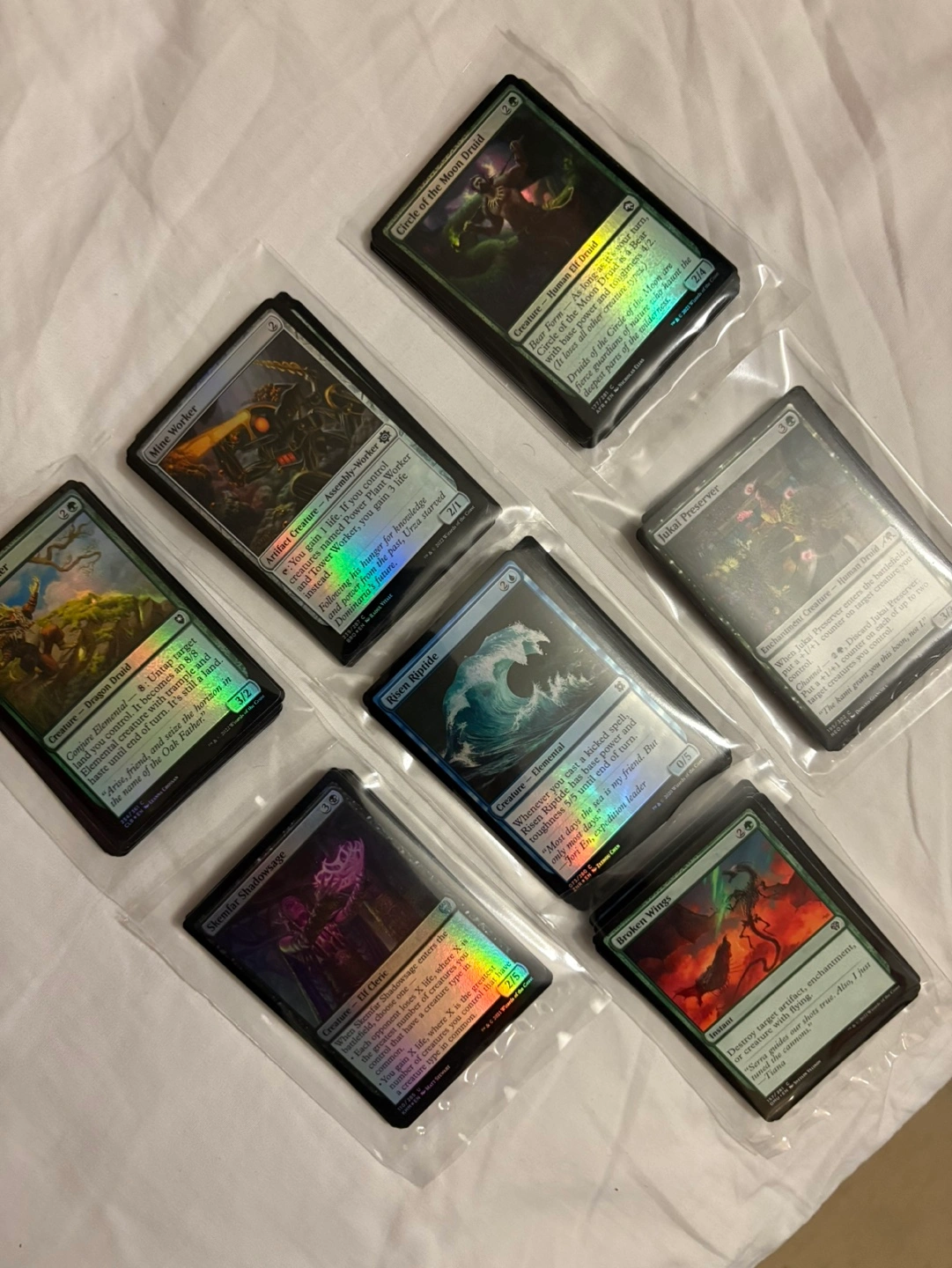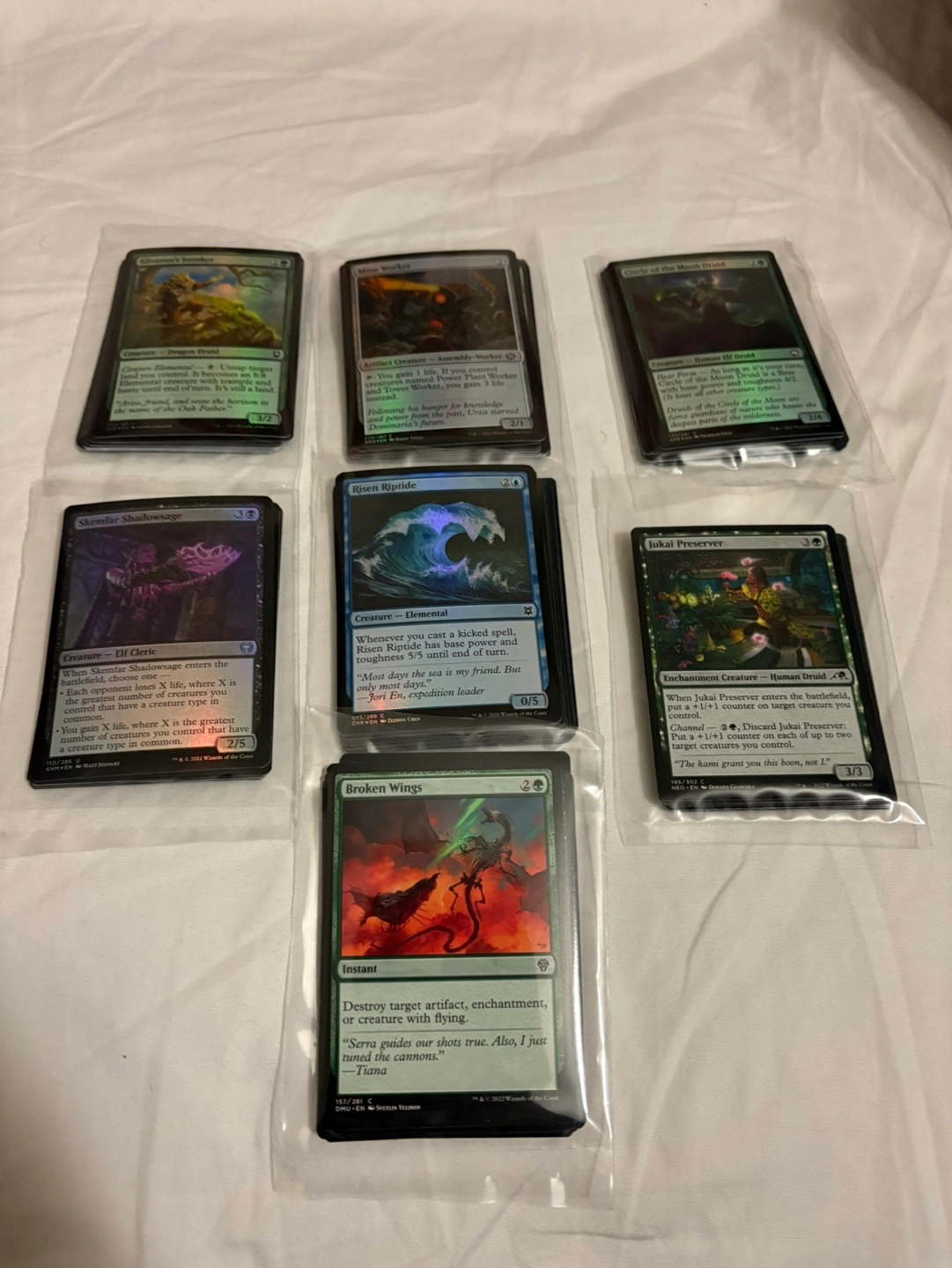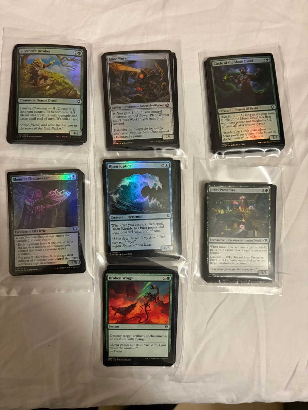 1000+Foil Magic: The Gathering cards, all in sleeves. Includes: Sylvanos's Invoker, Mine Worker, Circle of the Moon Druid, Ikal Preserve, Risen Riptide, Broken Wings, and Skemfar Shadowsage. 105 cards total (7 packs of 15) Includes some Foils and other cards as well! Getting rid of my collection. Price is for all 7 packs of random assorted cards