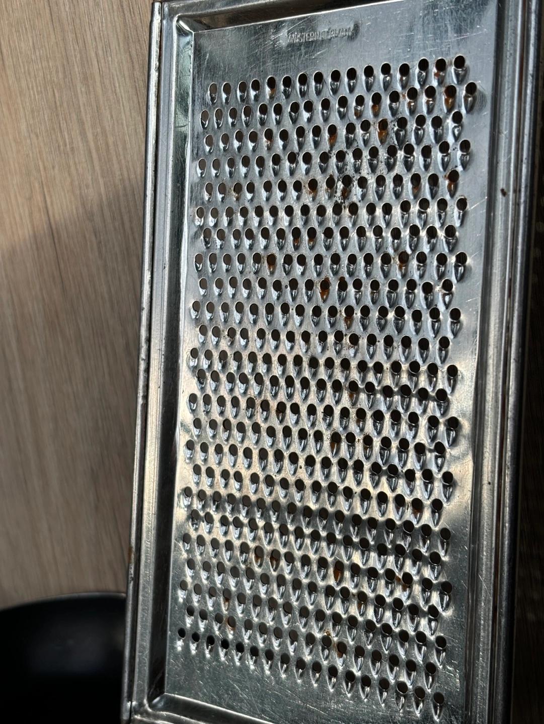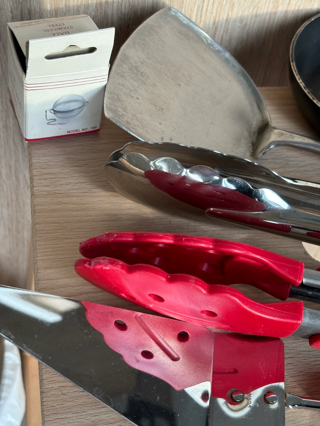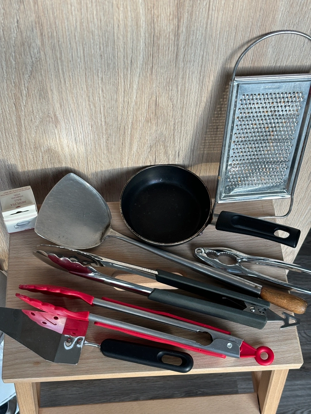 687Bundle of 8 kitchen utensils, includes a spatula, tongs, a grater, a small frying pan, a nutcracker, and other items. Note the grater has some rust marks