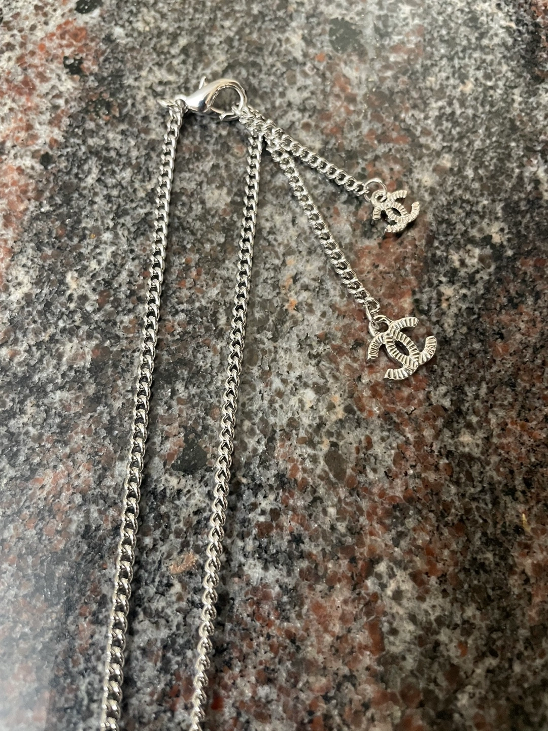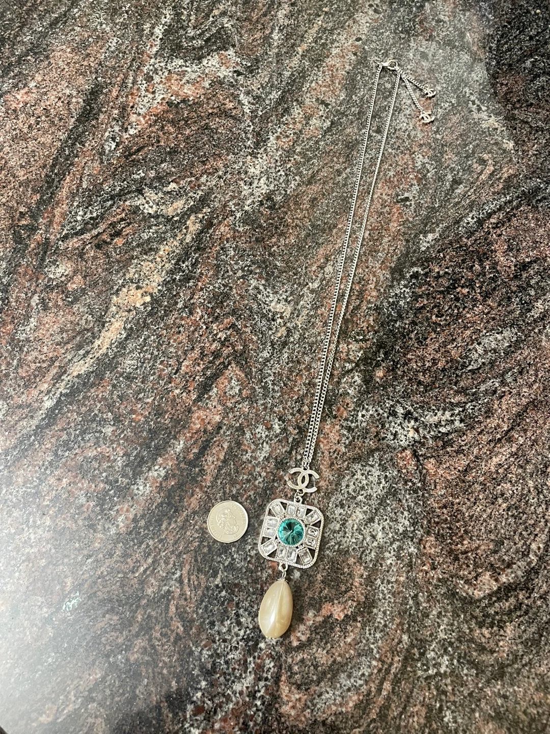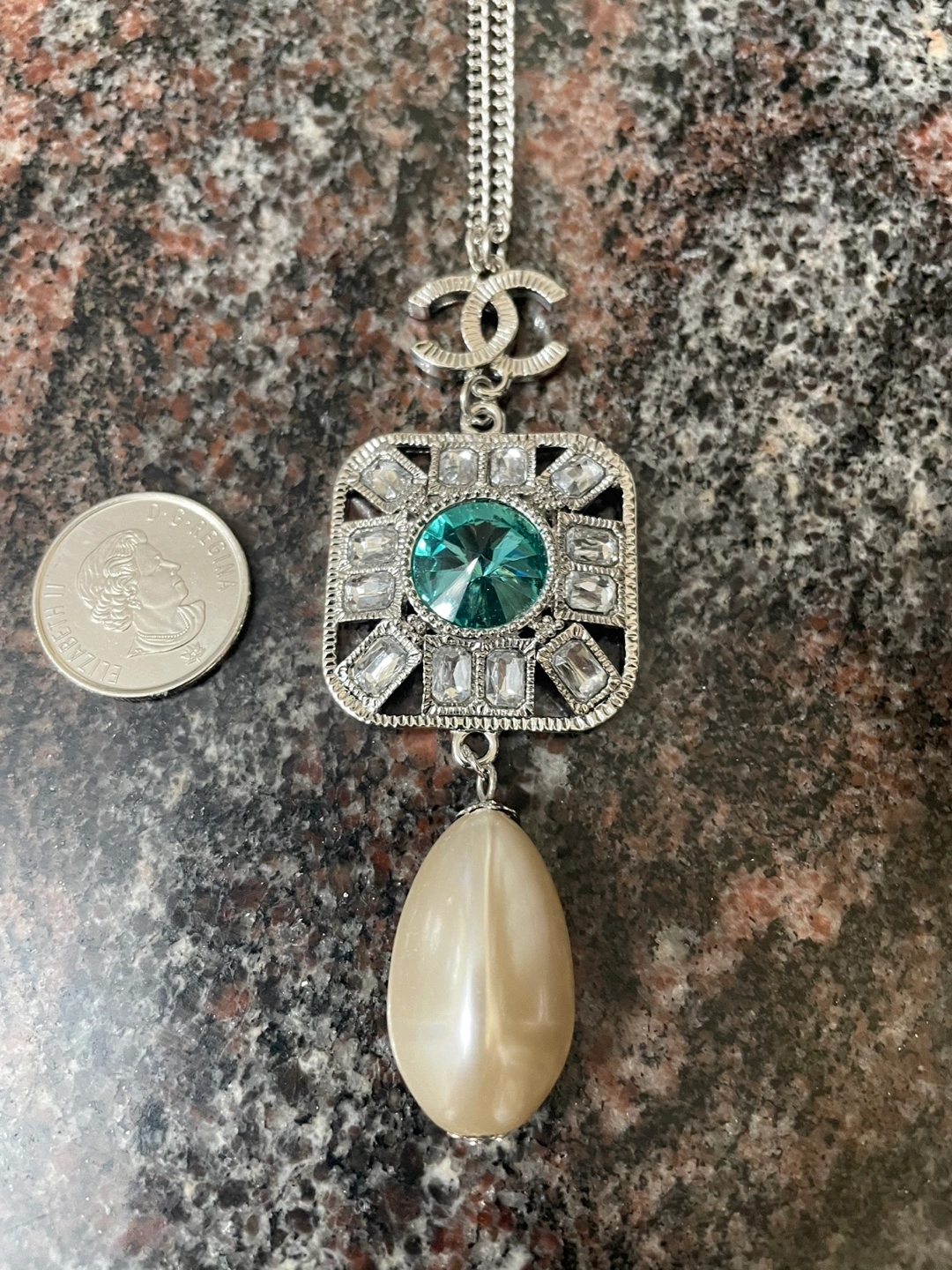 Silver chain with three charms, one featuring the Chanel logo. A large pendant with a light blue crystal in the center. The pendant is surrounded by smaller clear crystals. A large pearlescent drop dangles from the bottom.