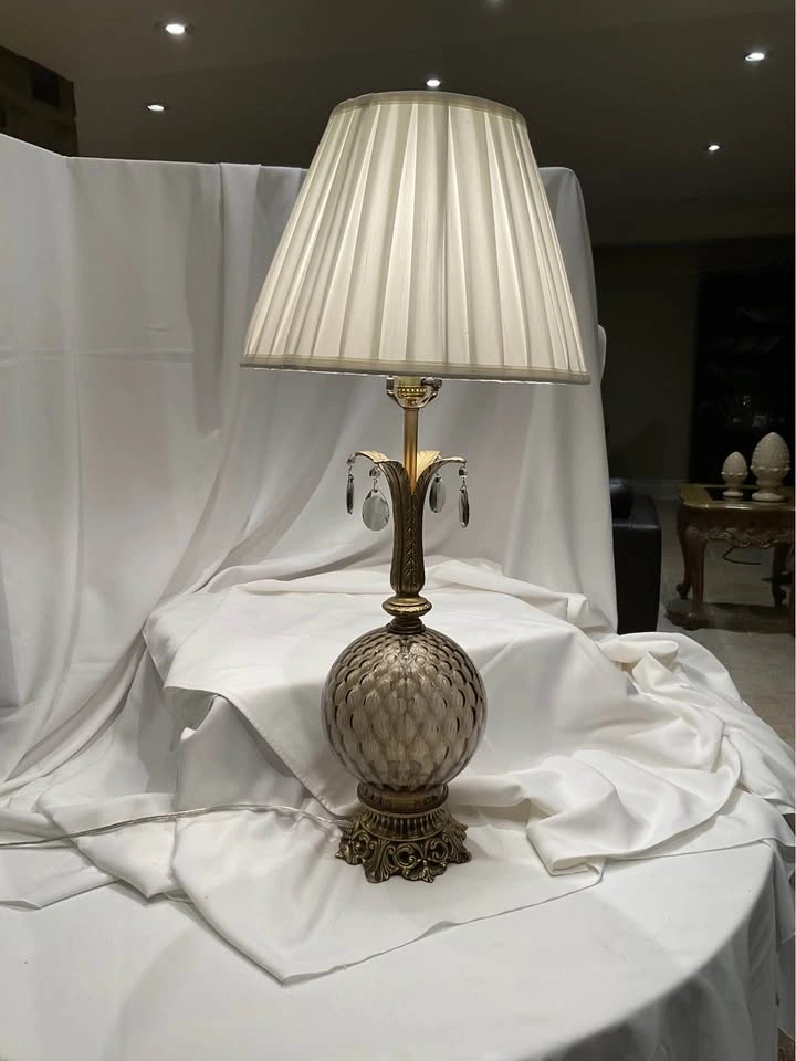 Beautiful vintage Hollywood table lamp from the 1960s. Features a glass bubble center in amber. In pristine condition from a smoke and pet-free home. Located in Richmond Hill near Bathurst & King Rd.