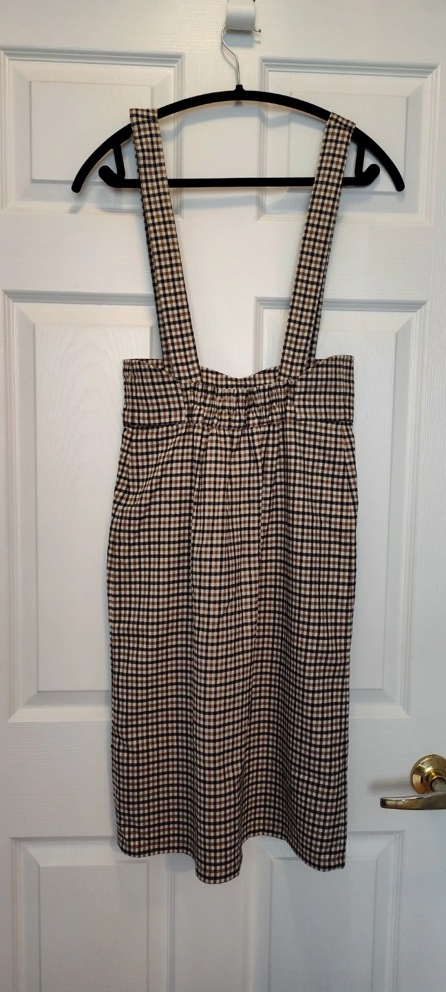 This stylish pinafore dress features a classic plaid pattern in brown, black, and beige. It has adjustable straps, and two front pockets. Made from a comfortable cotton blend fabric. Perfect for a casual outing or layering!