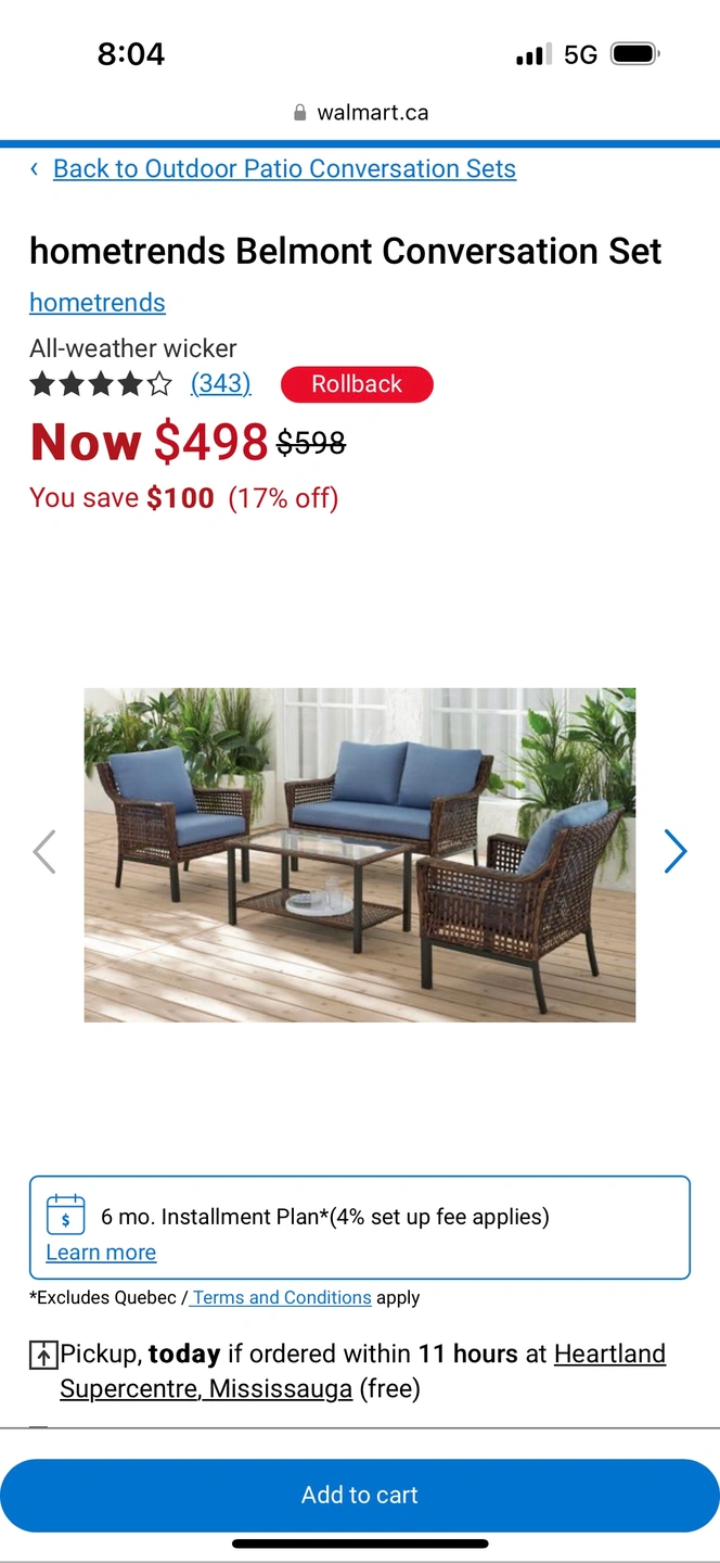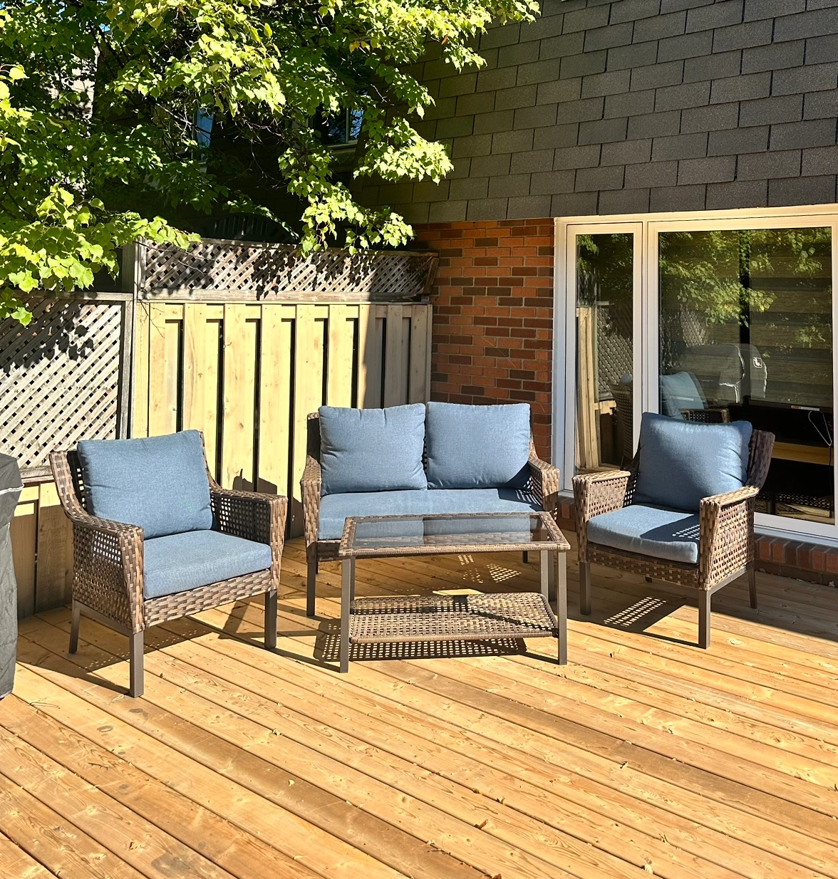 Patio furniture set with blue cushions. Includes a loveseat, two armchairs, and a coffee table with a glass top.