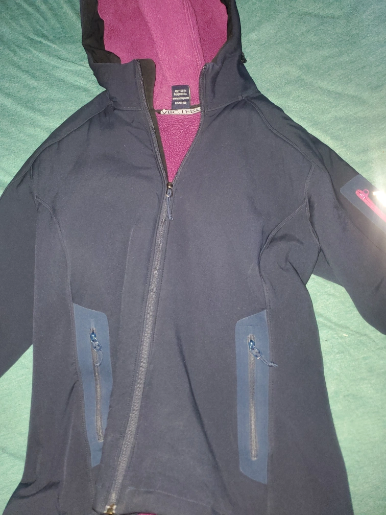 67Black jacket with a pink fleece lining. Features a hood and zipper closure. fully waterproof gortex 70$